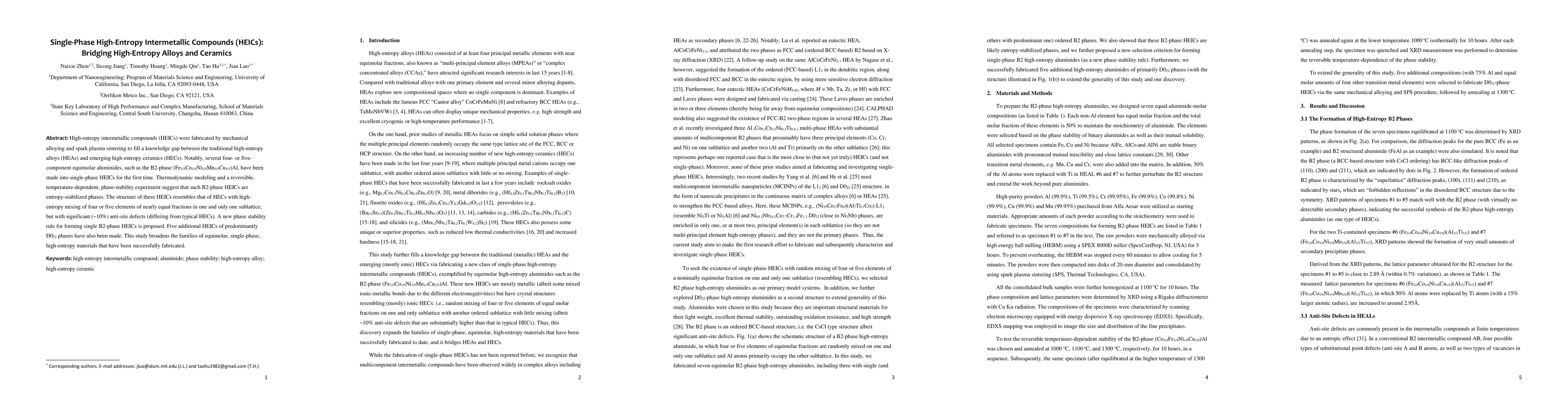This paper reports the successful fabrication of single-phase high-entropy intermetallic compounds (HEICs) via mechanical alloying and spark plasma sintering, bridging high-entropy alloys and ceramics. The study introduces new B2-phase HEICs, such as (Fe1/5Co1/5Ni1/5Mn1/5Cu1/5)Al, and proposes a new phase stability rule for their formation.