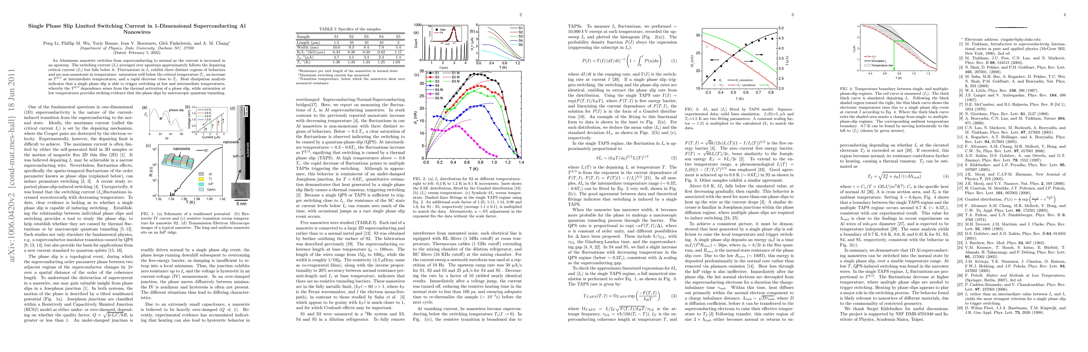 This paper investigates the current-induced phase transition in 1D superconducting Al nanowires, revealing a switching current that follows the depairing critical current but varies non-monotonically with temperature. The observed behaviors suggest that a single phase slip triggers the transition, with thermal activation and macroscopic quantum tunneling playing key roles.