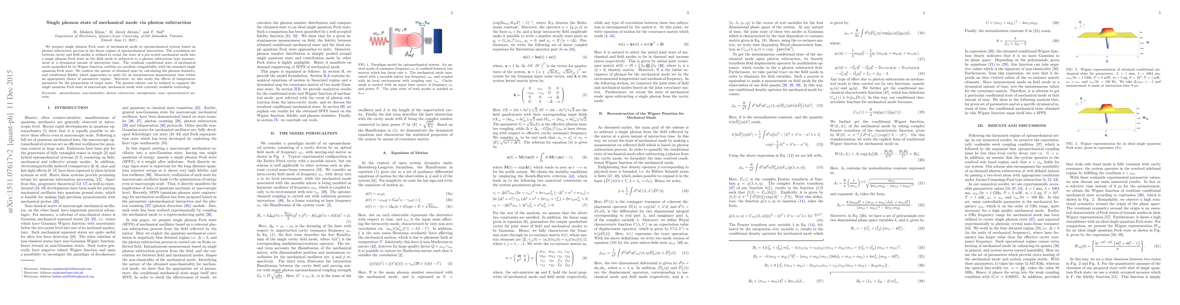 This paper details a method to prepare a single phonon Fock state of a mechanical mode in an optomechanical system through photon subtraction in the linear regime. The technique leverages correlations between cavity and field modes to achieve this, demonstrating high fidelity and compatibility with standard single quantum states.