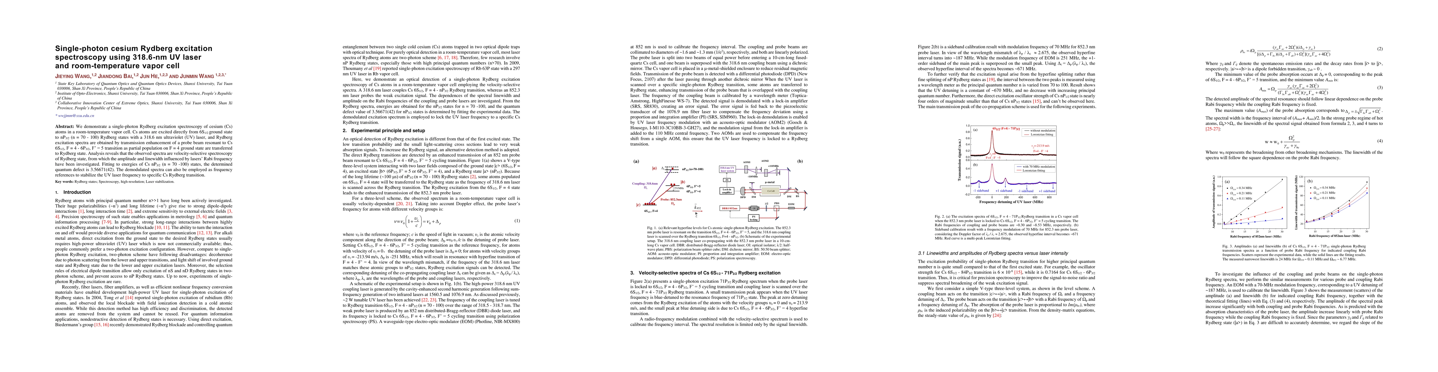 This research demonstrates single-photon Rydberg excitation spectroscopy of cesium atoms using a 318.6 nm UV laser in a room-temperature vapor cell, revealing velocity-selective Rydberg excitation spectra and determining a quantum defect of 3.56671(42). The demodulated spectra can stabilize the UV laser frequency to specific cesium Rydberg transitions.