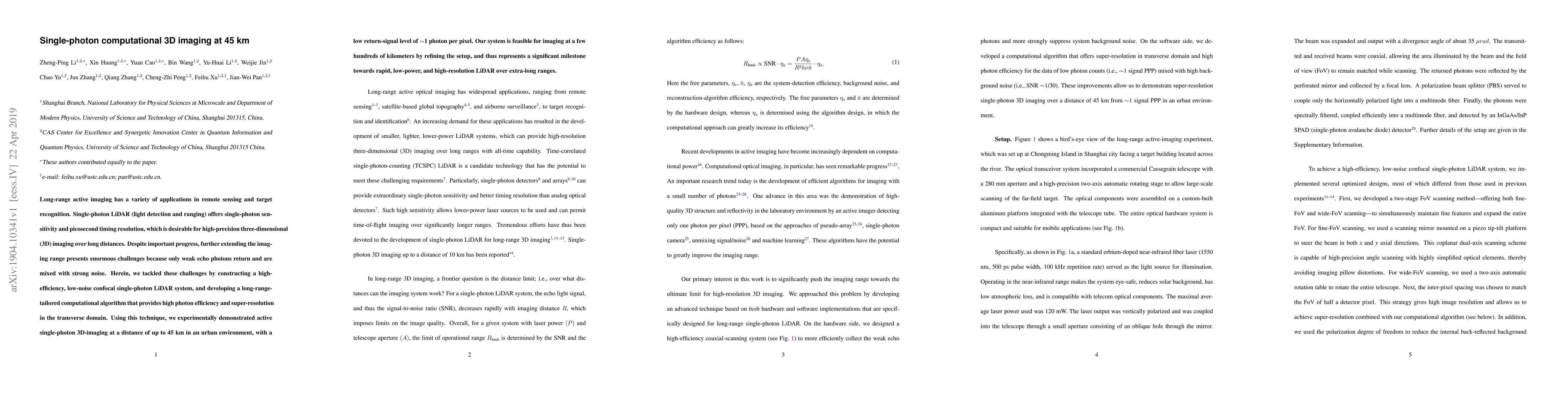 This paper presents a high-efficiency, low-noise single-photon LiDAR system and a tailored computational algorithm for long-range 3D imaging, achieving successful imaging at 45 km in urban settings. The system's potential for further refinement suggests it could enable rapid, low-power, high-resolution LiDAR over hundreds of kilometers.