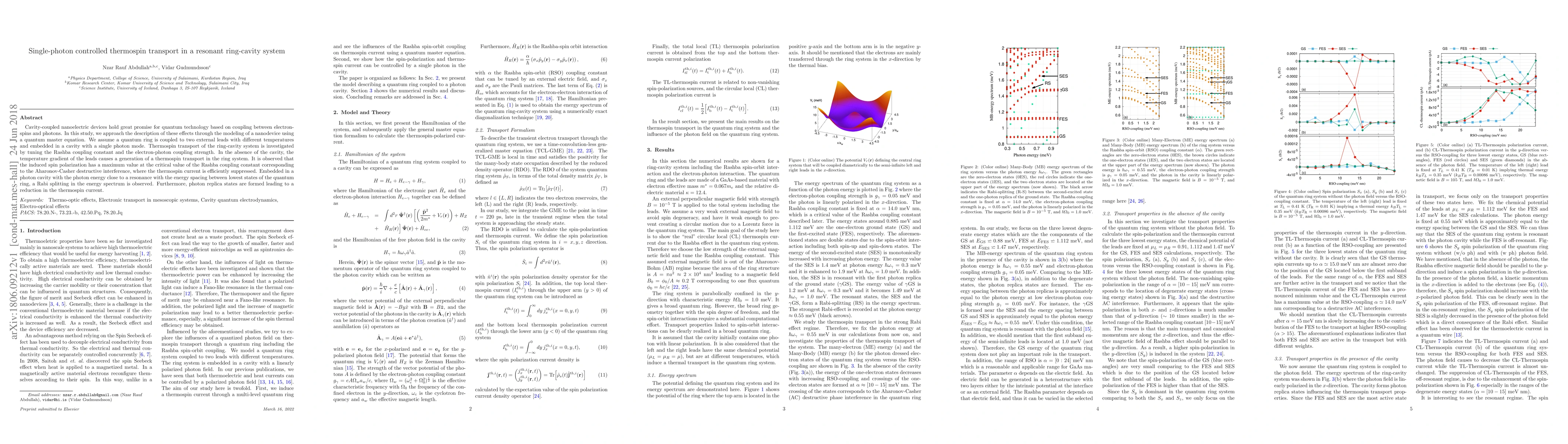This paper models a quantum ring-cavity system to investigate thermospin transport, finding that the spin polarization peaks at the critical Rashba coupling constant, while cavity resonance induces Rabi splitting and photon replica states, reducing the thermospin current.
