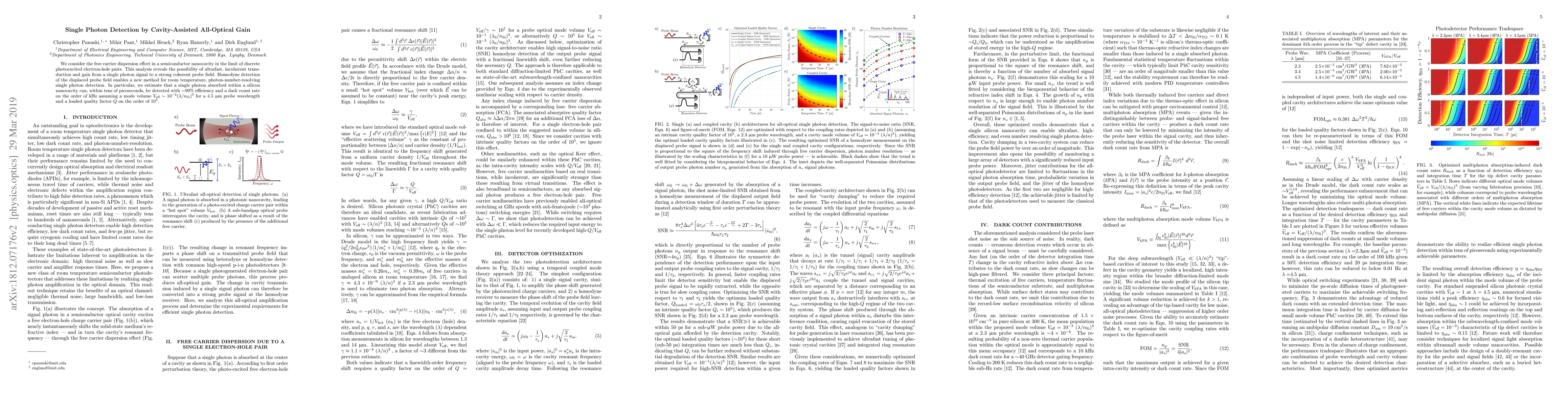 We consider the free carrier dispersion effect in a semiconductor nanocavity in the limit of discrete photoexcited electron-hole pairs. This analysis reveals the possibility of ultrafast, incoherent transduction and gain from a single photon signal to a strong coherent probe field. Homodyne detection of the displaced probe field enables a new method for room temperature, photon-number-resolving single photon detection. In particular, we estimate that a single photon absorbed within a silicon nanocavity can, within tens of picoseconds, be detected with $\sim 99\%$ efficiency and a dark count rate on the order of kHz assuming a mode volume $V_\text{eff}\sim 10^{-2}(\lambda/n_\text{Si})^3$ for a 4.5 micron probe wavelength and a loaded quality factor $Q$ on the order of $10^4$.