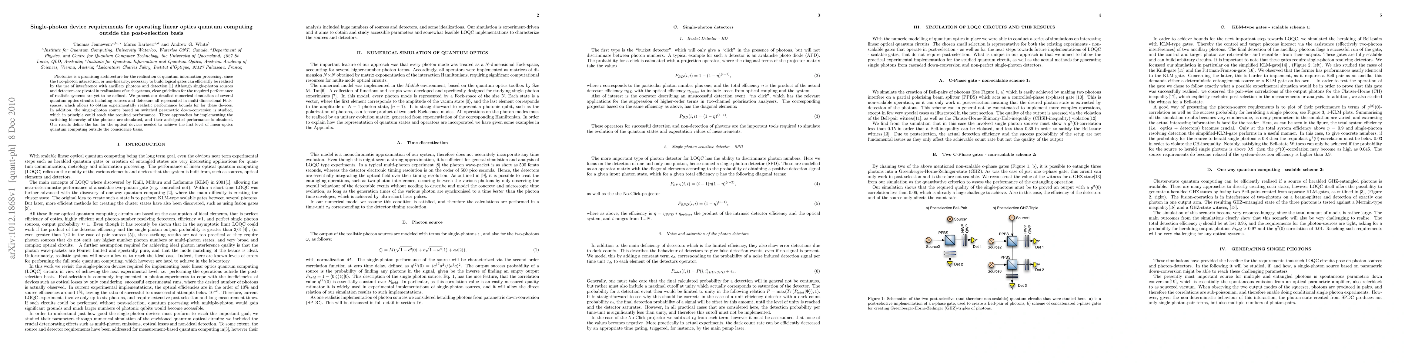 This paper presents detailed numerical simulations to determine the performance requirements for single-photon devices in linear optics quantum computing, beyond the post-selection basis. It evaluates various quantum optics circuits and explores a single-photon source based on switched parametric down-conversion, providing realistic performance bounds for these devices.