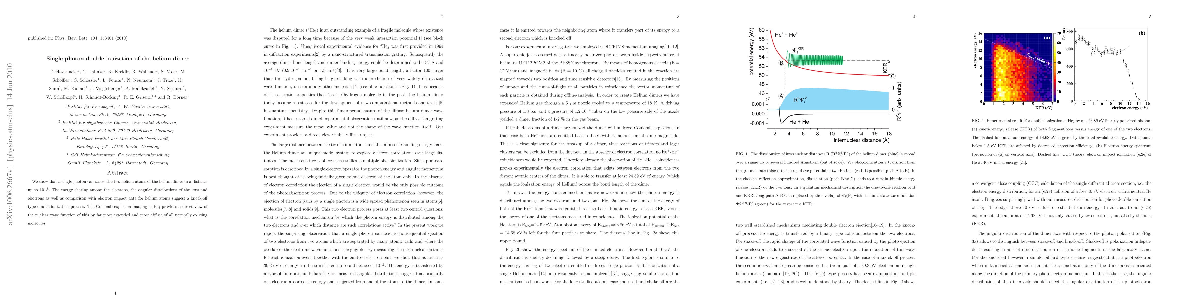 This study demonstrates that a single photon can simultaneously ionize both helium atoms in a helium dimer, up to 10 Å apart, indicating a knock-off double ionization process. The research provides insights into the nuclear wave function of the most diffuse naturally existing molecule through Coulomb explosion imaging.