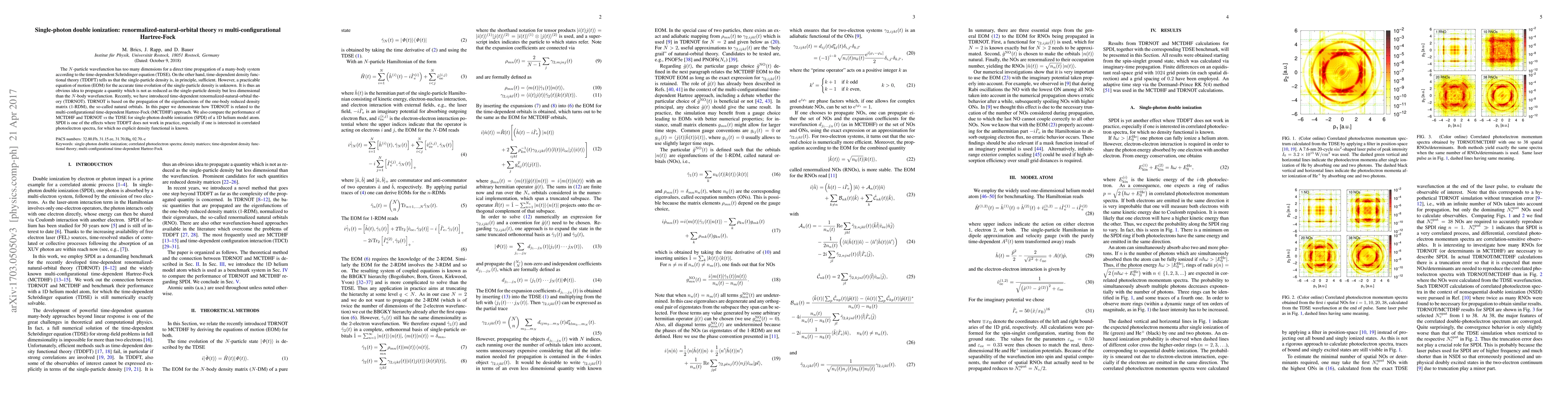This paper compares the performance of time-dependent renormalized-natural-orbital theory (TDRNOT) against multi-configurational time-dependent Hartree-Fock (MCTDHF) for the study of single-photon double ionization (SPDI) in a 1D helium model. The authors demonstrate the theoretical framework linking TDRNOT and MCTDHF, highlighting their respective advantages over the traditional time-dependent Schrödinger equation (TDSE).