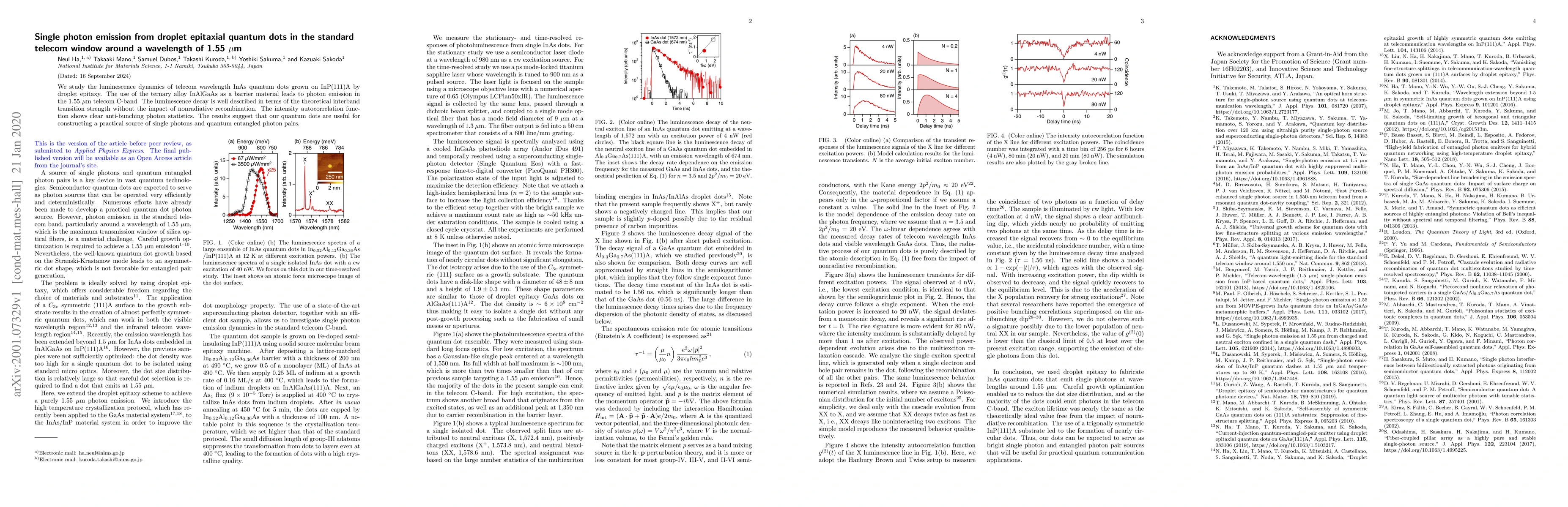 This paper investigates the luminescence dynamics of InAs quantum dots grown via droplet epitaxy on InP(111)A, emitting photons in the 1.55 µm telecom C-band. The study finds that the quantum dots exhibit clear anti-bunching and are suitable for generating single photons and quantum entangled photon pairs.
