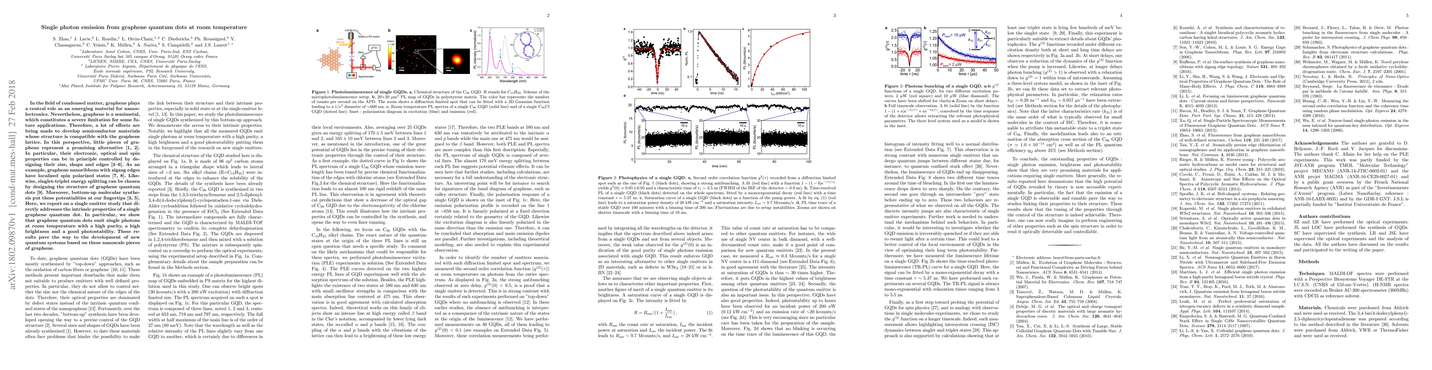 In the field of condensed matter, graphene plays a central role as an emerging material for nanoelectronics. Nevertheless, graphene is a semimetal, which constitutes a severe limitation for some future applications. Therefore, a lot of efforts are being made to develop semiconductor materials whose structure is compatible with the graphene lattice. In this perspective, little pieces of graphene represent a promising alternative. In particular, their electronic, optical and spin properties can be in principle controlled by designing their size, shape and edges. As an example, graphene nanoribbons with zigzag edges have localized spin polarized states. Likewise, singlet-triplet energy splitting can be chosen by designing the structure of graphene quantum dots. Moreover, bottom-up molecular synthesis put these potentialities at our fingertips. Here, we report on a single emitter study that directly addresses the intrinsic properties of a single graphene quantum dot. In particular, we show that graphene quantum dots emit single photons at room temperature with a high purity, a high brightness and a good photostability. These results pave the way to the development of new quantum systems based on these nanoscale pieces of graphene.