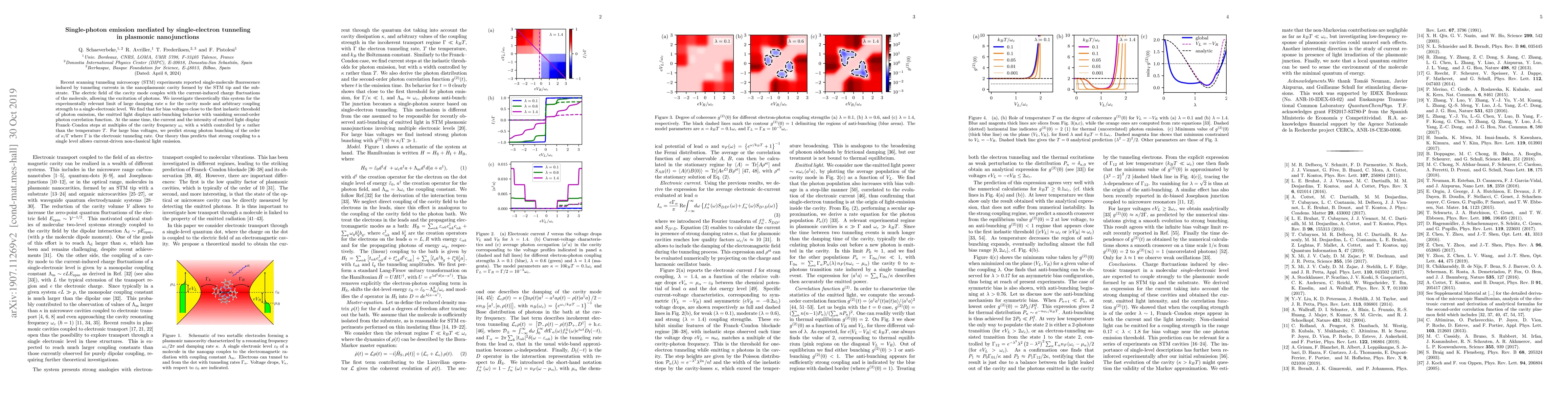This paper theoretically investigates single-photon emission in plasmonic nanojunctions, showing that strong coupling to a single electronic level can lead to current-driven non-classical light emission with anti-bunching behavior near the first inelastic threshold. For large bias voltages, it predicts strong photon bunching.