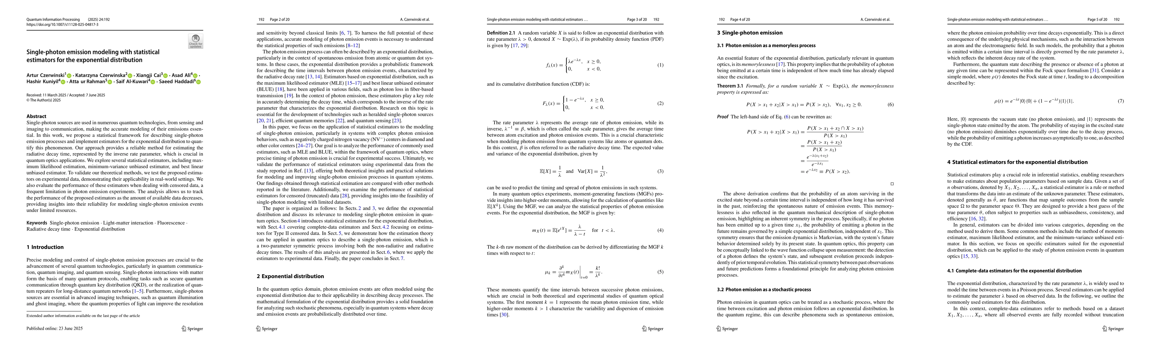 Single-photon sources are used in numerous quantum technologies, from sensing and imaging to communication, making the accurate modeling of their emissions essential. In this work, we propose a statistical framework for describing single-photon emission processes and implement estimators for the exponential distribution to quantify this phenomenon. Our approach provides a reliable method for estimating the radiative decay time, represented by the inverse rate parameter, which is crucial in quantum optics applications. We explore several statistical estimators, including maximum likelihood estimation, minimum-variance unbiased estimator, and best linear unbiased estimator. To validate our theoretical methods, we test the proposed estimators on experimental data, demonstrating their applicability in real-world settings. We also evaluate the performance of these estimators when dealing with censored data, a frequent limitation in photon emission experiments. The analysis allows us to track the performance of the proposed estimators as the amount of available data decreases, providing insights into their reliability for modeling single-photon emission events under limited resources.