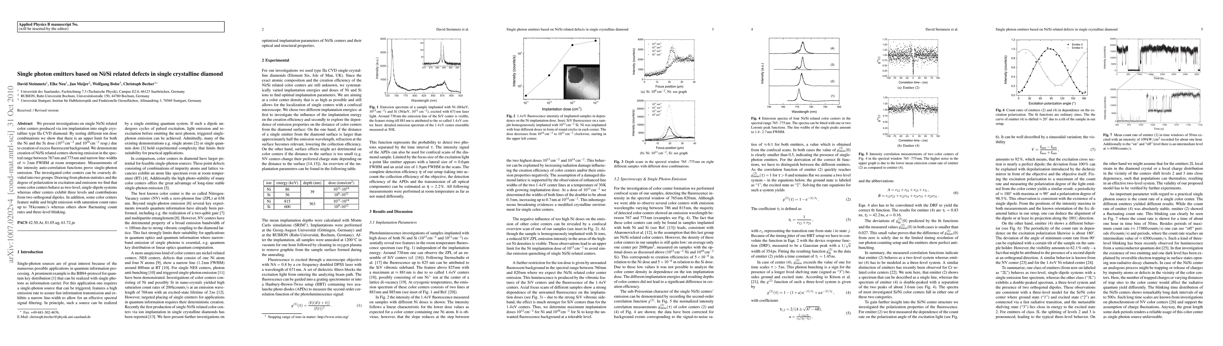 We present investigations on single Ni/Si related color centers produced via ion implantation into single crystalline type IIa CVD diamond. Testing different ion dose combinations we show that there is an upper limit for both the Ni and the Si dose 10^12/cm^2 and 10^10/cm^2 resp.) due to creation of excess fluorescent background. We demonstrate creation of Ni/Si related centers showing emission in the spectral range between 767nm and 775nm and narrow line-widths of 2nm FWHM at room temperature. Measurements of the intensity auto-correlation functions prove single-photon emission. The investigated color centers can be coarsely divided into two groups: Drawing from photon statistics and the degree of polarization in excitation and emission we find that some color centers behave as two-level, single-dipole systems whereas other centers exhibit three levels and contributions from two orthogonal dipoles. In addition, some color centers feature stable and bright emission with saturation count rates up to 78kcounts/s whereas others show fluctuating count rates and three-level blinking.
