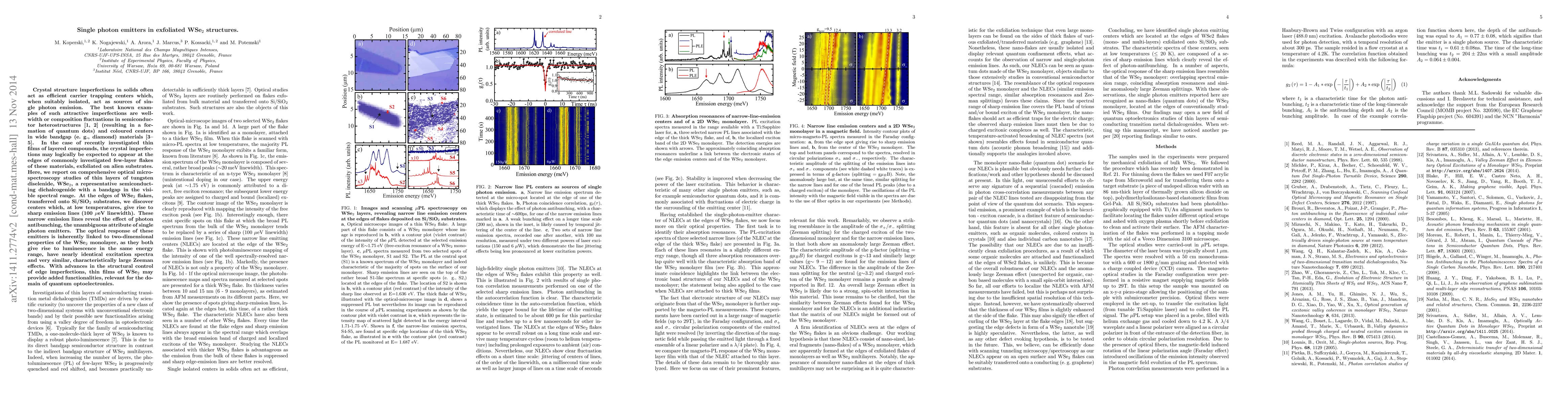 Crystal structure imperfections in solids often act as efficient carrier trapping centers which, when suitably isolated, act as sources of single photon emission. The best known examples of such attractive imperfections are wellwidth or composition fluctuations in semiconductor heterostructures (resulting in a formation of quantum dots) and coloured centers in wide bandgap (e. g., diamond) materials. In the case of recently investigated thin films of layered compounds, the crystal imperfections may logically be expected to appear at the edges of commonly investigated few-layer flakes of these materials, exfoliated on alien substrates. Here, we report on comprehensive optical microspectroscopy studies of thin layers of tungsten diselenide, WSe2, a representative semiconducting dichalcogenide with a bandgap in the visible spectral range. At the edges of WSe2 flakes, transferred onto Si/SiO2 substrates, we discover centers which, at low temperatures, give rise to sharp emission lines (0.1 meV linewidth). These narrow emission lines reveal the effect of photon antibunching, the unambiguous attribute of single photon emitters. The optical response of these emitters is inherently linked to two-dimensional properties of the WSe2 monolayer, as they both give rise to luminescence in the same energy range, have nearly identical excitation spectra and very similar, characteristically large Zeeman effects. With advances in the structural control of edge imperfections, thin films of WSe2 may provide added functionalities, relevant for the domain of quantum optoelectronics.
