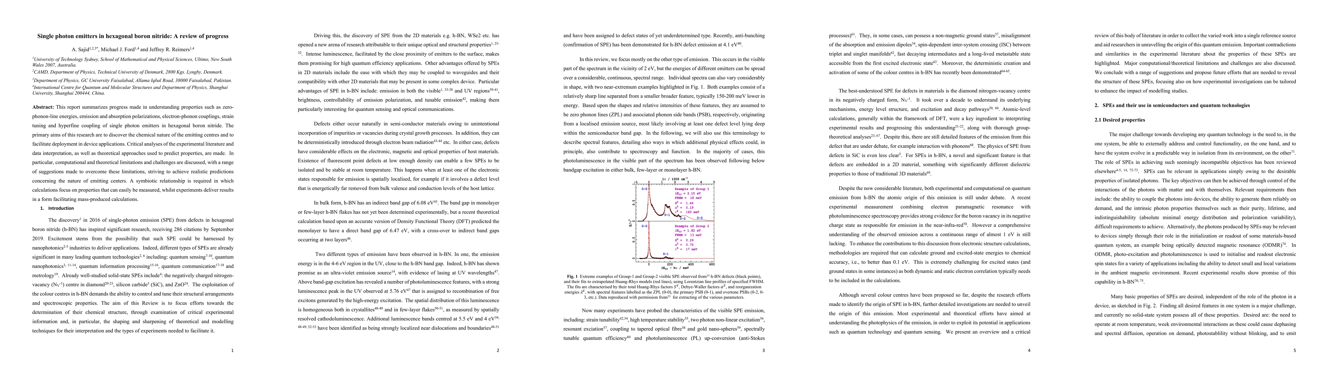 This report summarizes progress made in understanding properties such as zero-phonon-line energies, emission and absorption polarizations, electron-phonon couplings, strain tuning and hyperfine coupling of single photon emitters in hexagonal boron nitride. The primary aims of this research are to discover the chemical nature of the emitting centres and to facilitate deployment in device applications. Critical analyses of the experimental literature and data interpretation, as well as theoretical approaches used to predict properties, are made. In particular, computational and theoretical limitations and challenges are discussed, with a range of suggestions made to overcome these limitations, striving to achieve realistic predictions concerning the nature of emitting centers. A symbiotic relationship is required in which calculations focus on properties that can easily be measured, whilst experiments deliver results in a form facilitating mass-produced calculations.