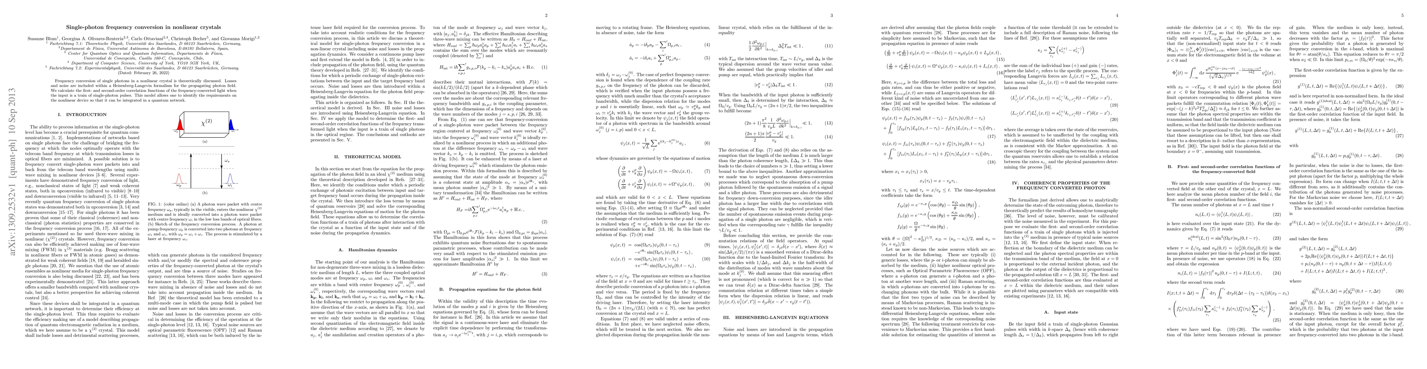 This paper theoretically explores single-photon frequency conversion in nonlinear crystals, incorporating losses and noise using a Heisenberg-Langevin formalism. It calculates first- and second-order correlation functions for frequency-converted light from single-photon pulses, identifying necessary conditions for integration into quantum networks.