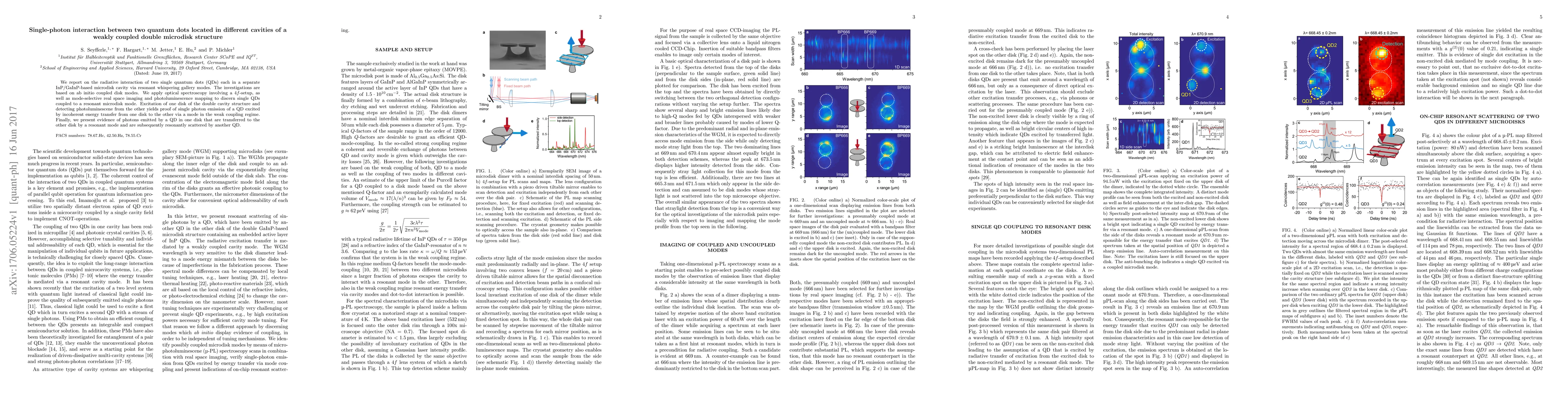We report on the radiative interaction of two single quantum dots (QDs) each in a separate InP/GaInP-based microdisk cavity via resonant whispering gallery modes. The investigations are based on ab initio coupled disk modes. We apply optical spectroscopy involving a $4f$-setup, as well as mode-selective real space imaging and photoluminescence mapping to discern single QDs coupled to a resonant microdisk mode. Excitation of one disk of the double cavity structure and detecting photoluminescene from the other yields proof of single photon emission of a QD excited by incoherent energy transfer from one disk to the other via a mode in the weak coupling regime. Finally, we present evidence of photons emitted by a QD in one disk that are transferred to the other disk by a resonant mode and are subsequently resonantly scattered by another QD.