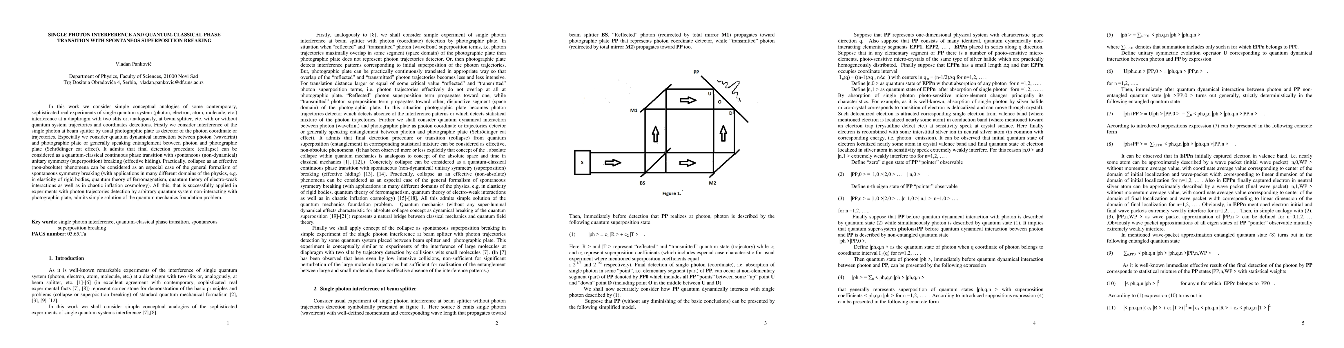 In this work we consider various experiments of single or two photon interference at beam splitter with or without photon trajectories and coordinates (selective) detection. Especially we consider quantum dynamical interaction between photon and photon coordinate detector or generally speaking photon-detector entanglement existence (Schrodinger cat effect). It admits that final detection procedure (collapse) can be considered as a quantum-classical continuous phase transition with spontaneous (non-dynamical) unitary symmetry (superposition) breaking (effective hiding). Practically, collapse as an effective (non-absolute) phenomena can be considered as an especial case of the general formalism of spontaneous symmetry breaking (with applications in many different domains of the physics, e.g. in elasticity of rigid bodies, quantum theory of ferromagnetism, quantum theory of electro-weak interactions as well as in chaotic inflation cosmology). All this admits simple solution of the quantum mechanics foundation problem.
