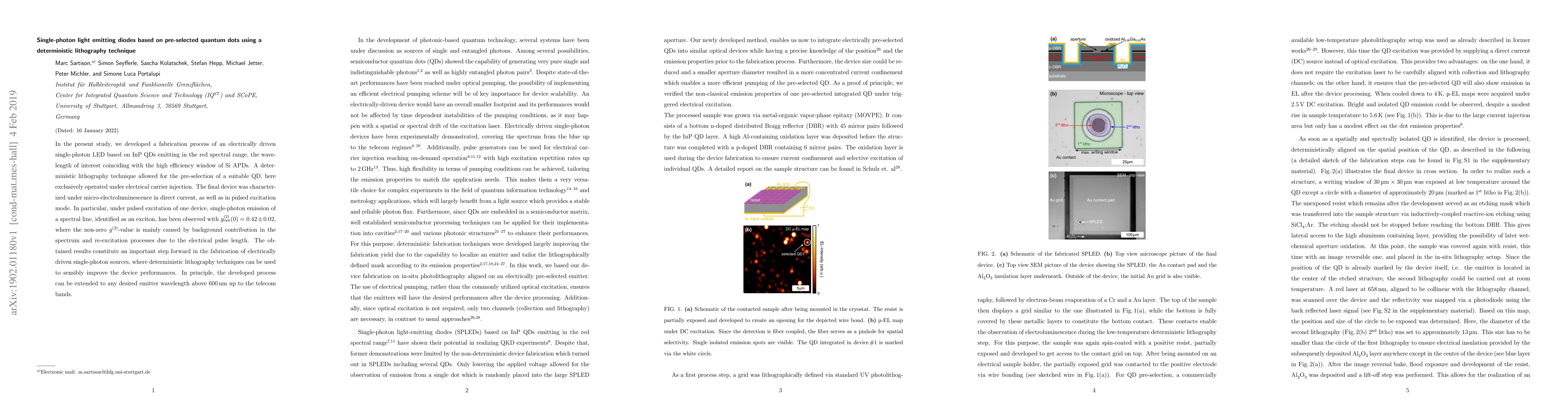 In the present study, we developed a fabrication process of an electrically driven single-photon LED based on InP QDs emitting in the red spectral range, the wavelength of interest coinciding with the high efficiency window of Si APDs. A deterministic lithography technique allowed for the pre-selection of a suitable QD, here exclusively operated under electrical carrier injection. The final device was characterized under micro-electroluminescence in direct current, as well as in pulsed excitation mode. In particular, under pulsed excitation of one device, single-photon emission of a spectral line, identified as an exciton, has been observed with $g^{(2)}_\mathrm{raw}(0)=0.42\pm0.02$, where the non-zero $g^{(2)}$-value is mainly caused by background contribution in the spectrum and re-excitation processes due to the electrical pulse length. The obtained results constitute an important step forward in the fabrication of electrically driven single-photon sources, where deterministic lithography techniques can be used to sensibly improve the device performances. In principle, the developed process can be extended to any desired emitter wavelength above $600\,\mathrm{nm}$ up to the telecom bands.