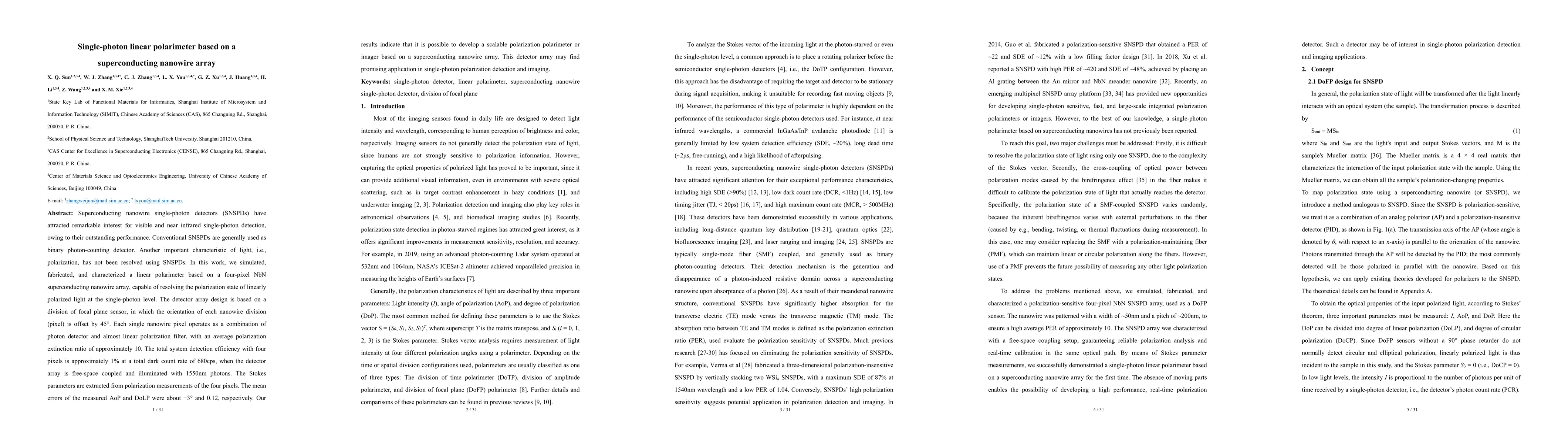 The paper describes the development of a linear polarimeter using a four-pixel NbN superconducting nanowire array capable of detecting the polarization state of single photons. The array's design allows for precise measurement of polarization with a mean error of about -3 degrees for the angle of polarization and 0.12 for degree of linear polarization, demonstrating potential for single-photon polarization detection and imaging applications.
