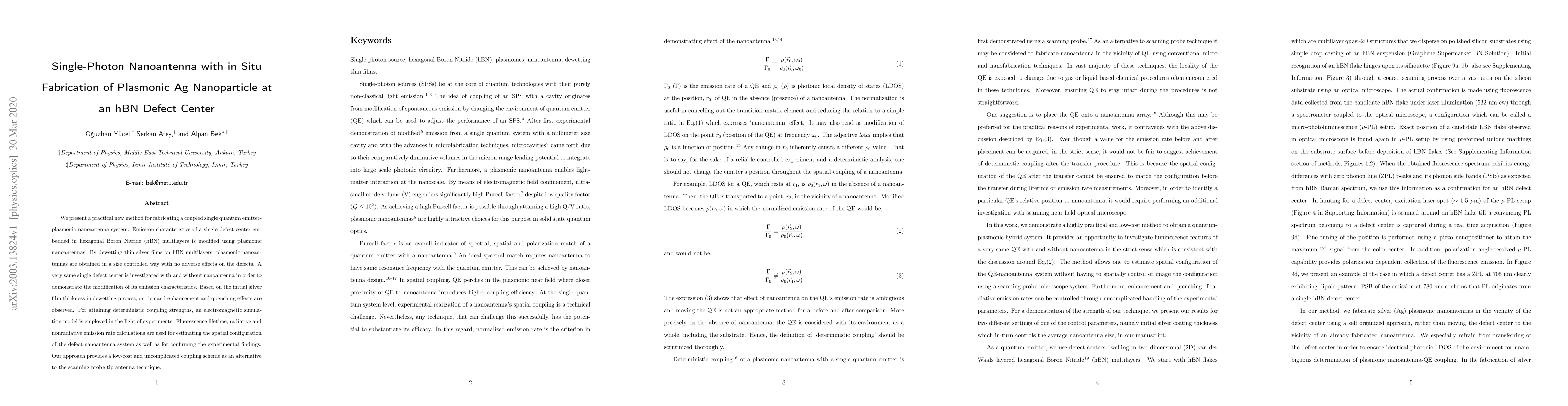 We present a practical new method for fabricating a coupled single quantum emitter-plasmonic nanoantenna system. Emission characteristics of a single defect center embedded in hexagonal Boron Nitride (hBN) multilayers is modified using plasmonic nanoantennas. By dewetting thin silver films on hBN multilayers, plasmonic nanoantennas are obtained in a size controlled way with no adverse effects on the defects. A very same single defect center is investigated with and without nanoantenna in order to demonstrate the modification of its emission characteristics. Based on the initial silver film thickness in dewetting process, on-demand enhancement and quenching effects are observed. For attaining deterministic coupling strengths, an electromagnetic simulation model is employed in the light of experiments. Fluorescence lifetime, radiative and nonradiative emission rate calculations are used for estimating the spatial configuration of the defect-nanoantenna system as well as for confirming the experimental findings. Our approach provides a low-cost and uncomplicated coupling scheme as an alternative to the scanning probe tip antenna technique.