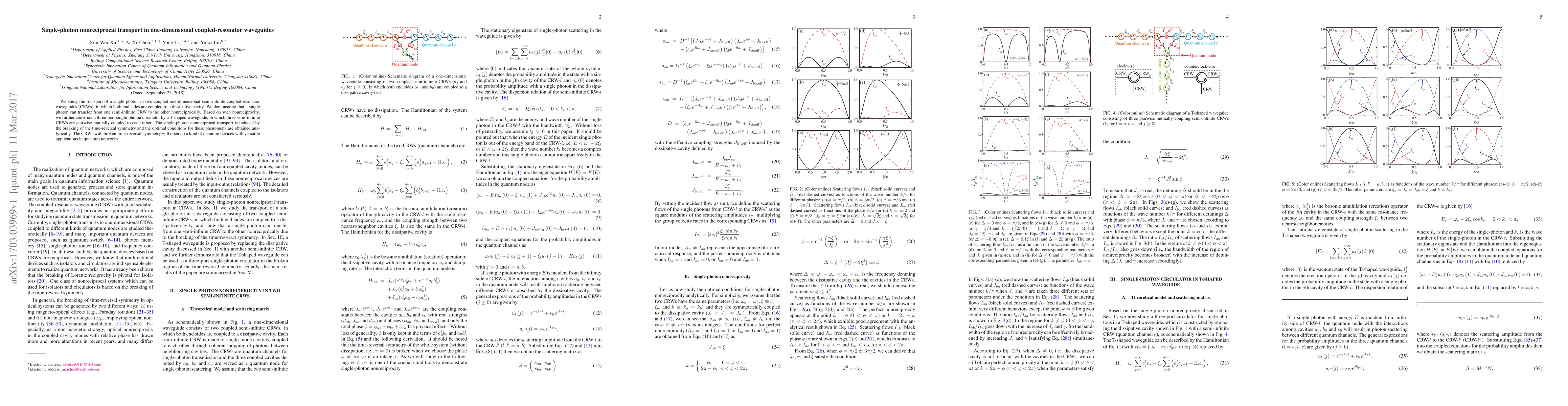 This paper investigates single-photon nonreciprocal transport in coupled-resonator waveguides, demonstrating that photons can transfer between two waveguides in a nonreciprocal manner. It constructs a three-port single-photon circulator using T-shaped waveguides, highlighting potential applications in quantum networks.