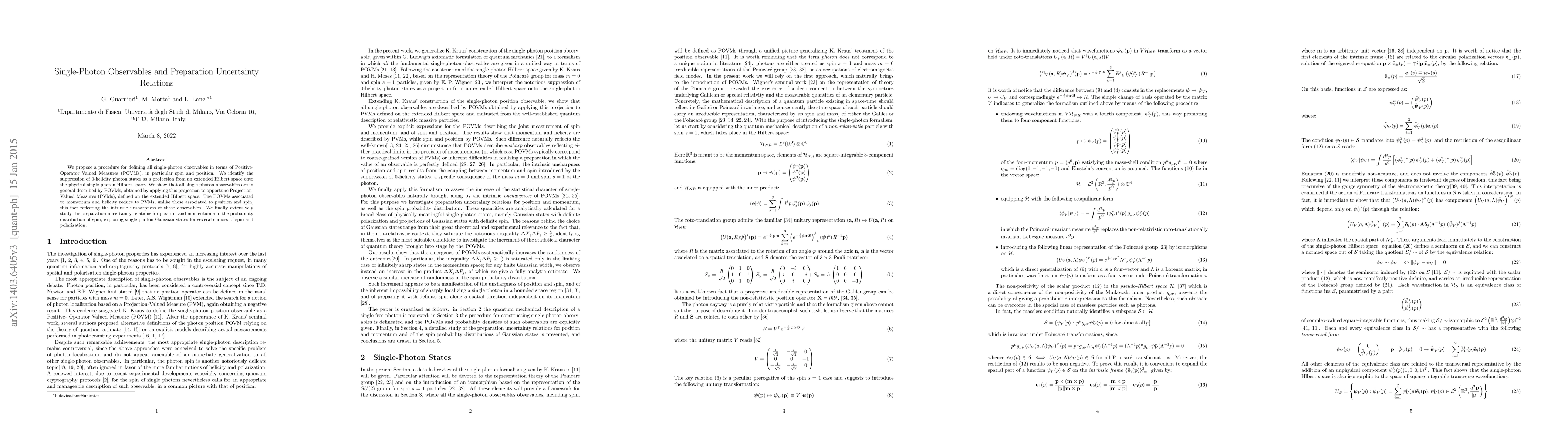 This paper defines single-photon observables using Positive-Operator Valued Measures (POVMs), particularly for spin and position, and explores the unsharpness of these observables. It also investigates preparation uncertainty relations and the probability distribution of spin within single photon Gaussian states.