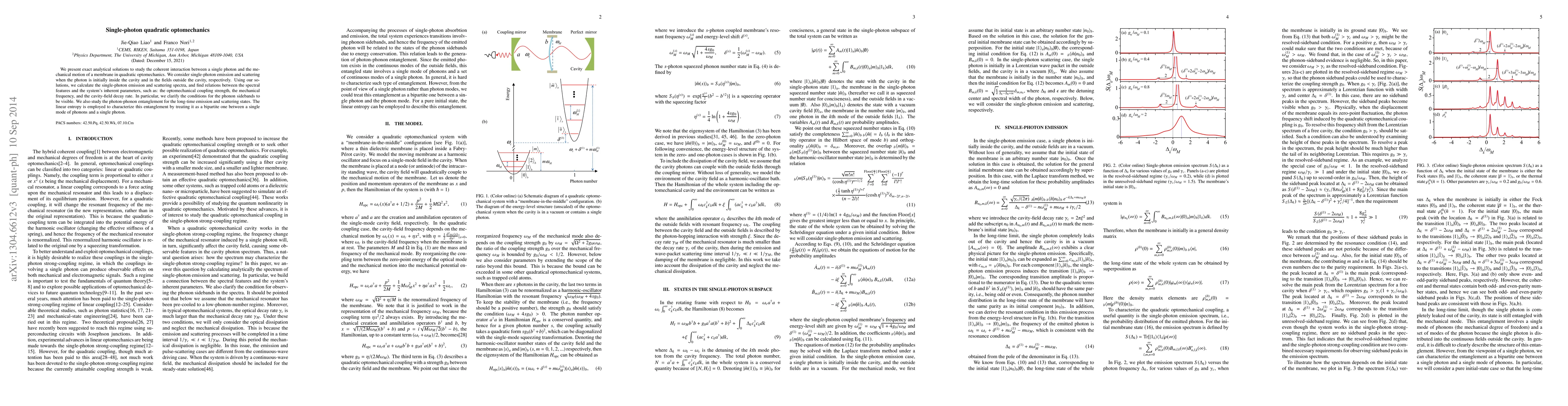 This paper provides analytical solutions for the interaction between a single photon and a membrane's mechanical motion in quadratic optomechanics, detailing emission and scattering spectra. It identifies conditions for visible phonon sidebands and examines photon-phonon entanglement, using linear entropy to quantify it.