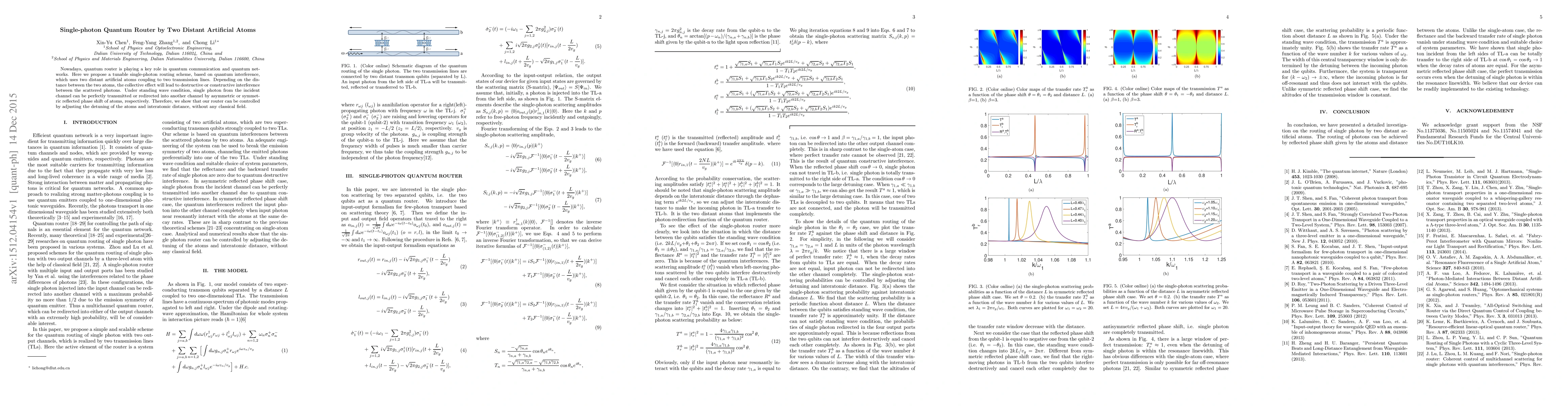This paper proposes a tunable single-photon quantum router based on quantum interference using two distant artificial atoms. The router can redirect single photons by controlling the interference effects through the distance and detuning of the atoms, enabling quantum communication without classical fields.