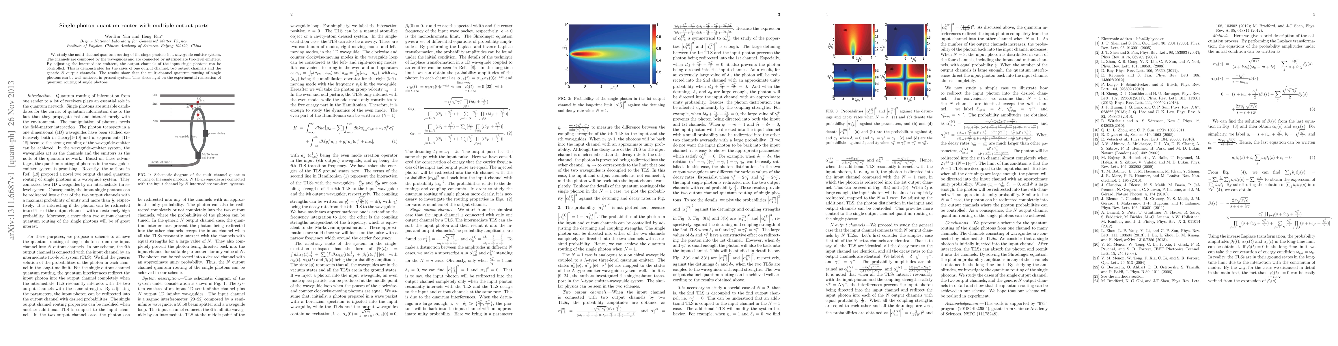 This paper presents a method for multi-channel quantum routing of single photons using waveguides and intermediate two-level emitters, demonstrating control over one, two, or N output channels. The results indicate successful experimental realization of quantum routing, advancing the field of quantum communication.