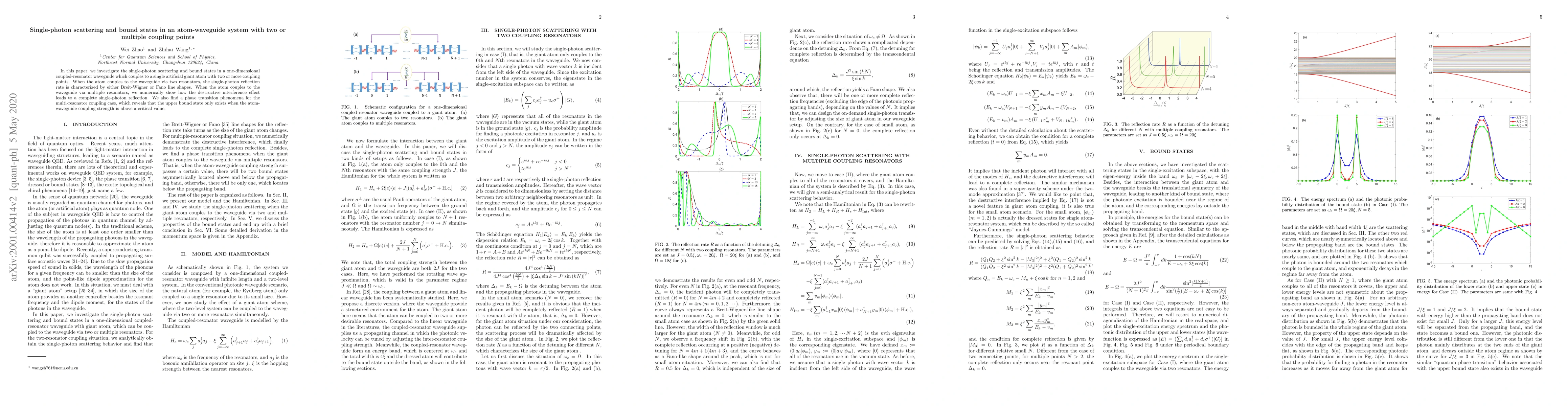 This paper explores single-photon scattering and bound states in a coupled-resonator waveguide connected to an artificial giant atom via two or multiple coupling points. The study reveals distinct reflection rates characterized by Breit-Wigner or Fano line shapes, and demonstrates complete single-photon reflection due to destructive interference in multi-resonator coupling scenarios, accompanied by a phase transition revealing the existence of upper bound states above a critical coupling strength.