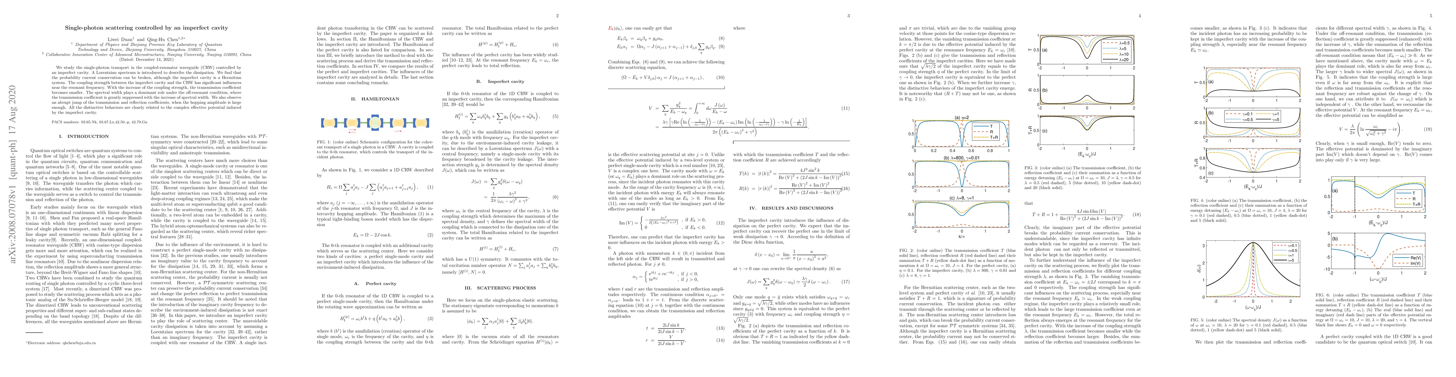 We study the single-photon transport in the coupled-resonator waveguide (CRW) controlled by an imperfect cavity. A Lorentzian spectrum is introduced to describe the dissipation. We find that the probability current conservation can be broken, although the imperfect cavity is a Hermitian system. The coupling strength between the imperfect cavity and the CRW has significant influences near the resonant frequency. With the increase of the coupling strength, the transmission coefficient becomes smaller. The spectral width plays a dominant role under the off-resonant condition, where the transmission coefficient is greatly suppressed with the increase of the spectral width. We also observe an abrupt jump of the transmission and reflection coefficients when the hopping amplitude is large enough. All the distinctive behaviors are closely related to the complex effective potential induced by the imperfect cavity.