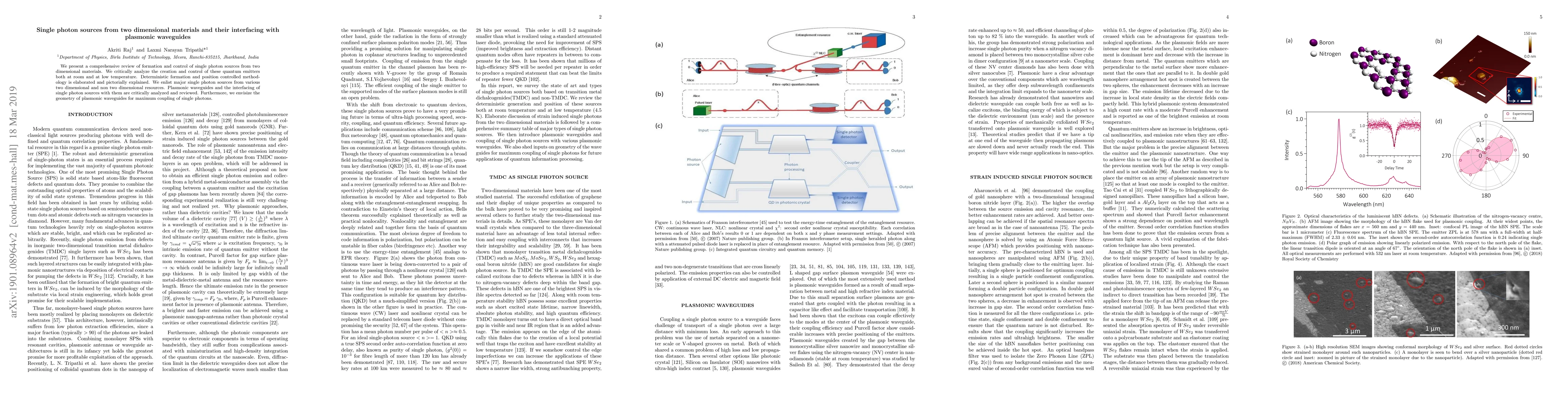 We present a comprehensive review of formation and control of single photon sources from two dimensional materials. We critically analyze the creation and control of these quantum emitters both at room and at low temperature. Deterministic formation and position controlled methodology is elaborated and pictorially explained. We enlist major single photon sources from various two dimensional and non two dimensional resources. Plasmonic waveguides and the interfacing of single photon sources with them are critically analyzed and reviewed. Furthermore, we envisize the geometry of plasmonic waveguides for maximum coupling of single photons.