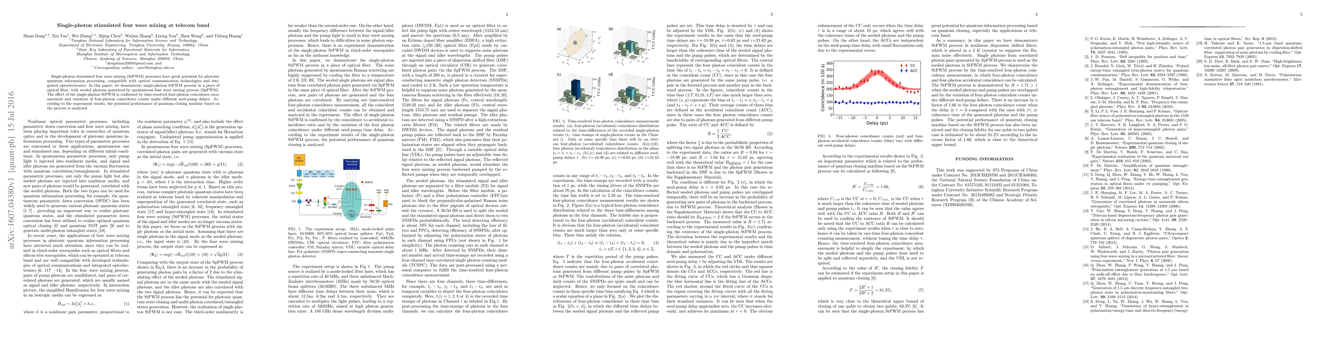 Single-photon stimulated four wave mixing (StFWM) processes have great potential for photonic quantum information processing, compatible with optical communication technologies and integrated optoelectronics. In this paper, we demonstrate single-photon StFWM process in a piece of optical fiber, with seeded photons generated by spontaneous four wave mixing process (SpFWM). The effect of the single-photon StFWM is confirmed by time-resolved four-photon coincidence measurement and variation of four-photon coincidence counts under different seed-pump delays. According to the experiment results, the potential performance of quantum cloning machine based on the process is analyzed.