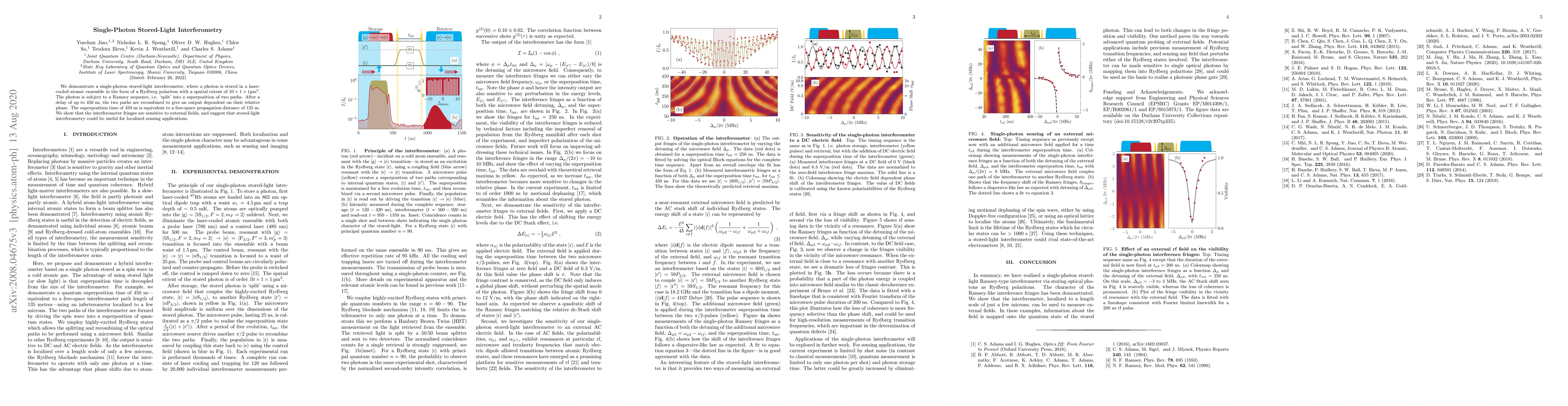 The research presents a single-photon stored-light interferometer using a laser-cooled atomic ensemble, storing a photon as a Rydberg polariton. The photon is then put into a superposition and maintained for up to 450 ns, equivalent to 135 m free-space propagation. The interferometer's output reveals phase sensitivity to external fields, proposing potential for localized sensing applications.