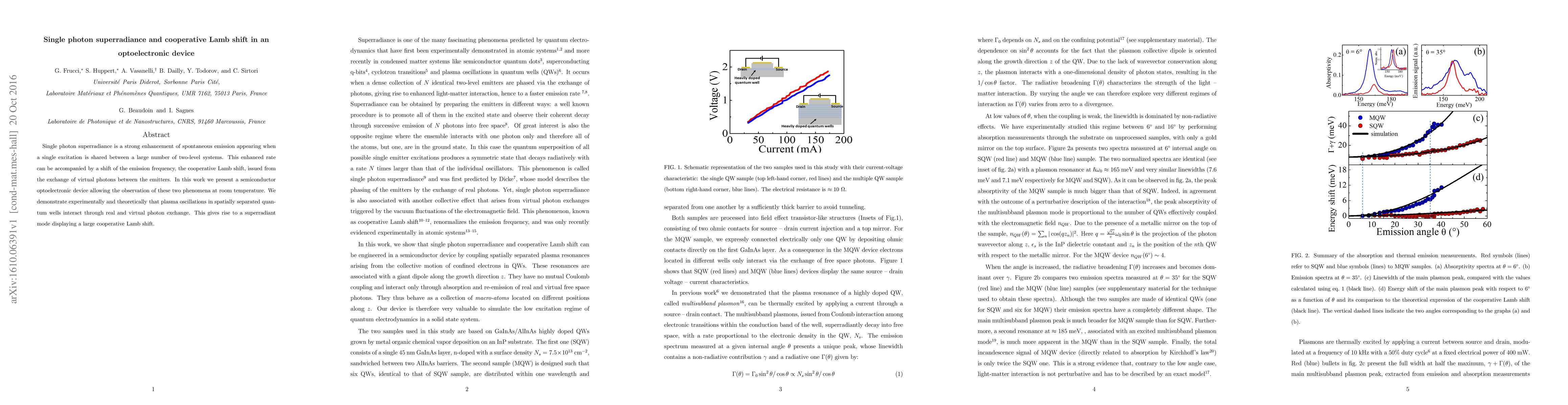This research paper demonstrates a semiconductor optoelectronic device that observes single photon superradiance and cooperative Lamb shift at room temperature. The study reveals that plasma oscillations in spatially separated quantum wells interact via real and virtual photon exchange, resulting in a superradiant mode with a significant cooperative Lamb shift.