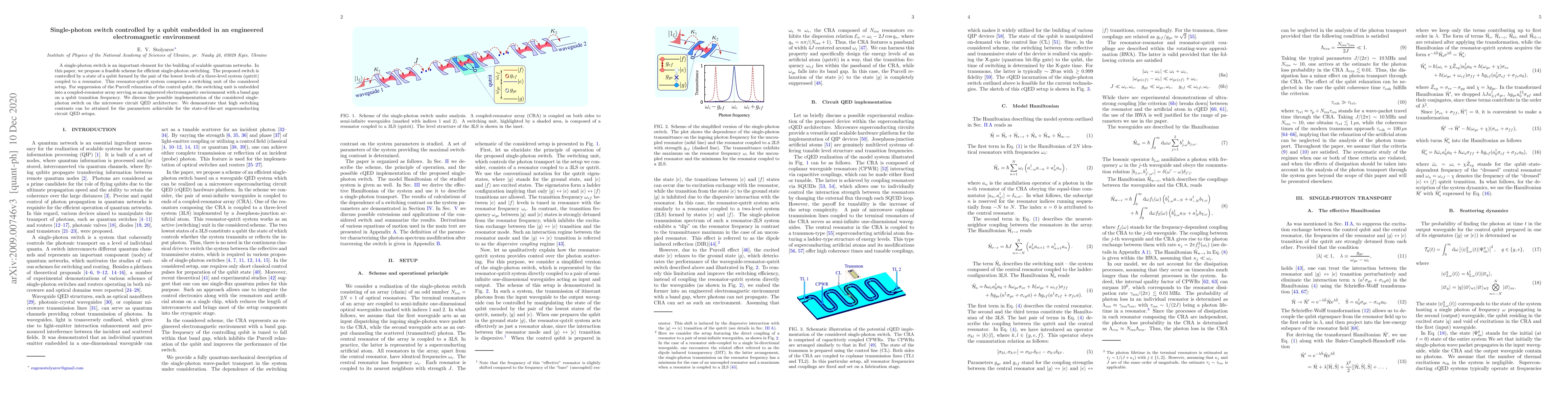 A single-photon switch is an important element for the building of scalable quantum networks. In this paper, we propose a feasible scheme for efficient single-photon switching. The proposed switch is controlled by a state of a qubit formed by the pair of the lowest levels of a three-level system (qutrit) coupled to a resonator. This resonator-qutrit system comprises a switching unit of the considered setup. For suppression of the Purcell relaxation of the control qubit, the switching unit is embedded into a coupled-resonator array serving as an engineered electromagnetic environment with a band gap on a qubit transition frequency. We discuss the possible implementation of the considered single-photon switch on the microwave circuit QED architecture. We demonstrate that high switching contrasts can be attained for the parameters achievable for the state-of-the-art superconducting circuit QED setups.