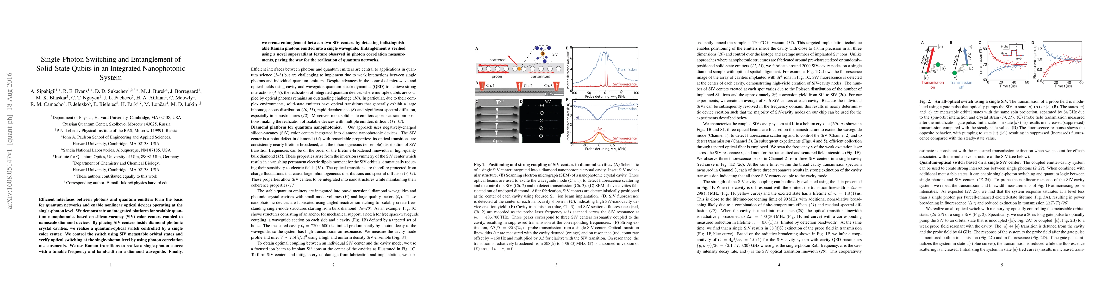 This paper demonstrates an integrated nanophotonic platform using silicon-vacancy color centers in diamond for scalable quantum networks, achieving single-photon switching and entanglement via metastable states and Raman transitions, with potential for quantum communication.