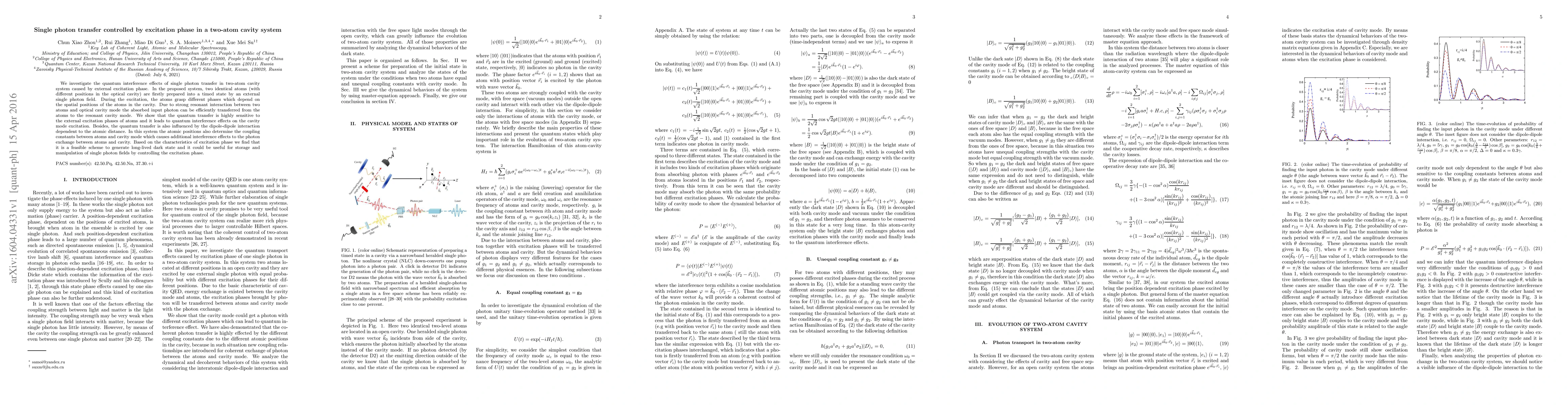 This paper explores quantum interference effects in a two-atom cavity system where single photon transfer is controlled by the external excitation phase. The study reveals that the phase difference due to spatial positions of atoms leads to significant quantum interference effects on the cavity mode, with potential applications for single photon storage and manipulation.
