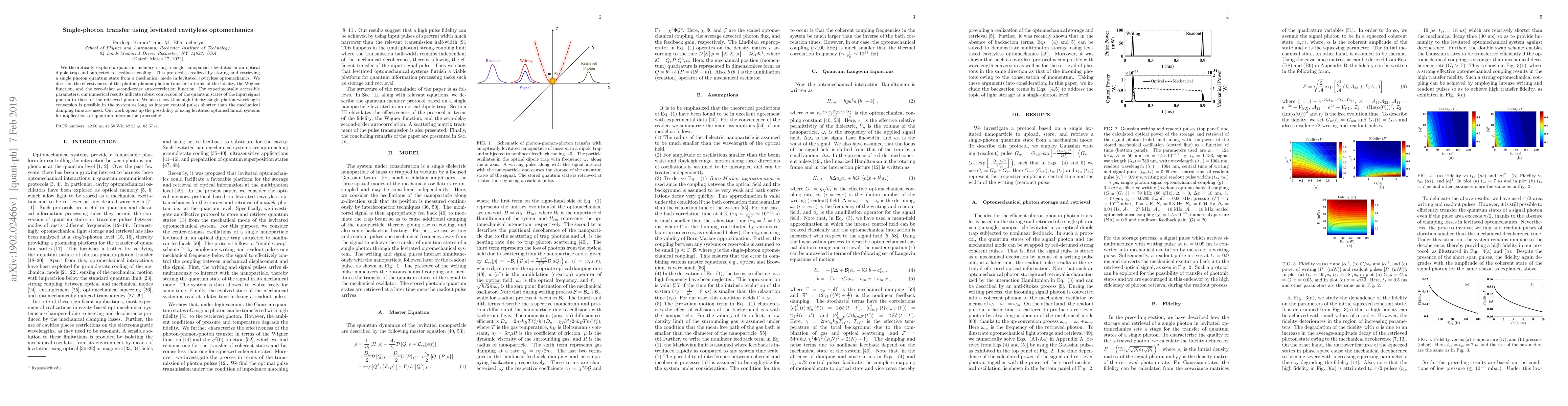 This paper explores a quantum memory system utilizing a levitated nanoparticle cooled by feedback in an optical trap, demonstrating effective single-photon transfer and storage via cavityless optomechanics. High fidelity single-photon wavelength conversion is achievable with appropriate control pulses, suggesting potential for quantum information processing applications.