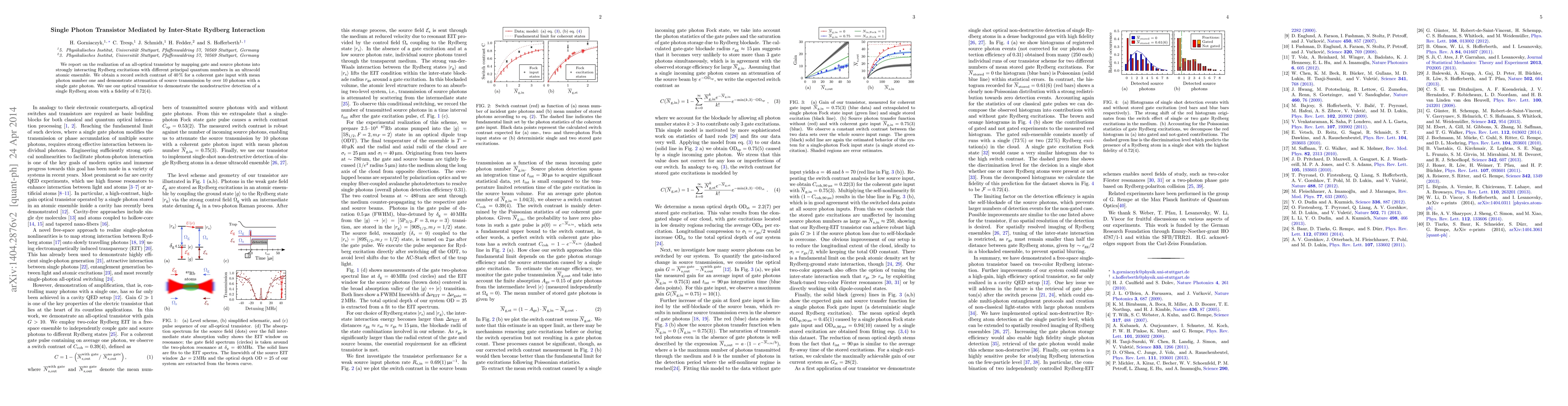We report on the realization of an all-optical transistor by mapping gate and source photons into strongly interacting Rydberg excitations with different principal quantum numbers in an ultracold atomic ensemble. We obtain a record switch contrast of 40 % for a coherent gate input with mean photon number one and demonstrate attenuation of source transmission by over 10 photons with a single gate photon. We use our optical transistor to demonstrate the nondestructive detection of a single Rydberg atom with a fidelity of 0.72(4).
