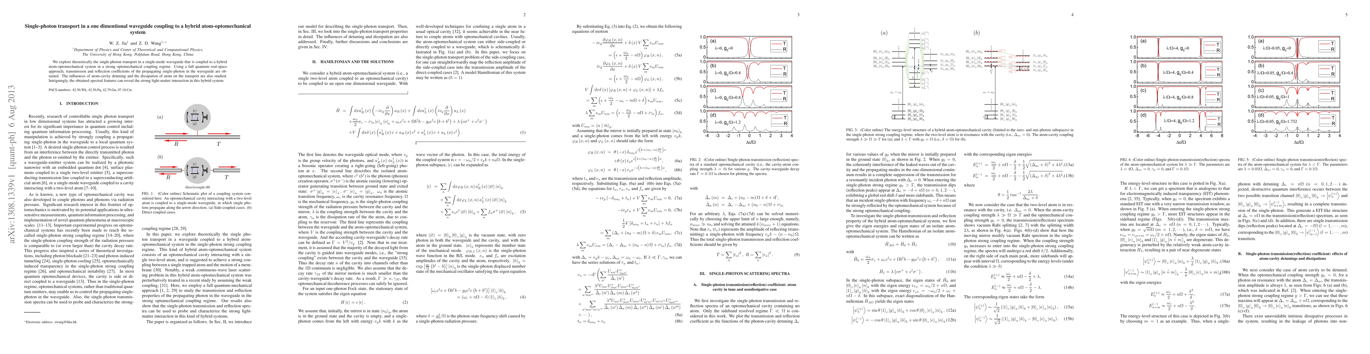 This paper theoretically investigates single-photon transport in a one-dimensional waveguide coupled to a hybrid atom-optomechanical system, revealing strong light-matter interaction. The study uses a full quantum approach to determine transmission and reflection coefficients, and examines the effects of atom-cavity detuning and atom dissipation on photon transport.