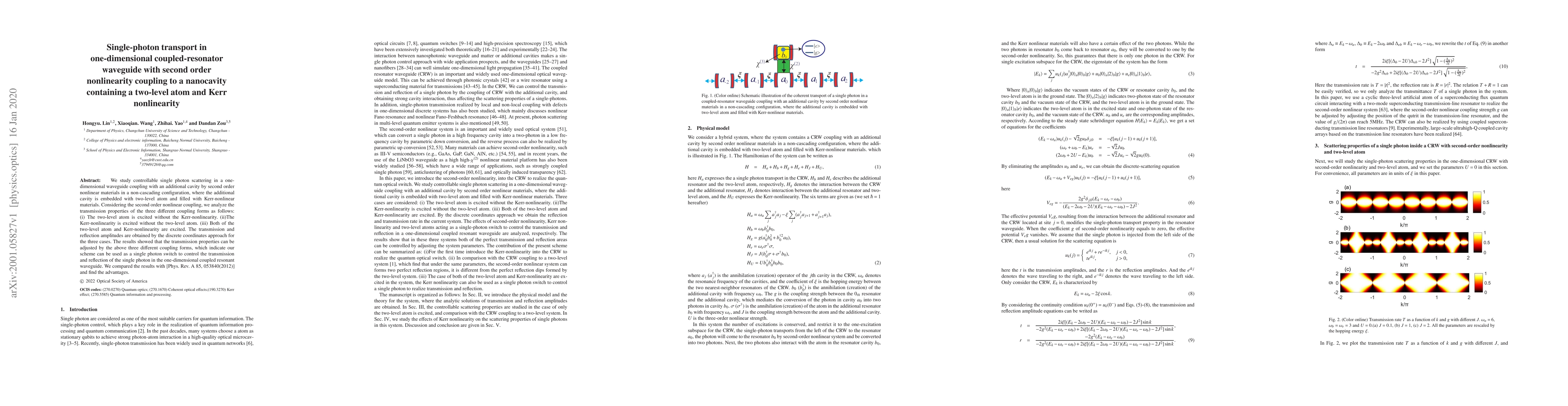 We study controllable single photon scattering in a one-dimensional waveguide coupling with an additional cavity by second order nonlinear materials in a non-cascading configuration, where the additional cavity is embedded with two-level atom and filled with Kerr-nonlinear materials. Considering the second order nonlinear coupling, we analyze the transmission properties of the three different coupling forms as follows: (i) The two-level atom is excited without the Kerr-nonlinearity. (ii)The Kerr-nonlinearity is excited without the two-level atom. (iii) Both of the two-level atom and Kerr-nonlinearity are excited. The transmission and reflection amplitudes are obtained by the discrete coordinates approach for the three cases. The results showed that the transmission properties can be adjusted by the above three different coupling forms, which indicate our scheme can be used as a single photon switch to control the transmission and reflection of the single photon in the one-dimensional coupled resonant waveguide. We compared the results with [Phys. Rev. A 85, 053840(2012)] and find the advantages.