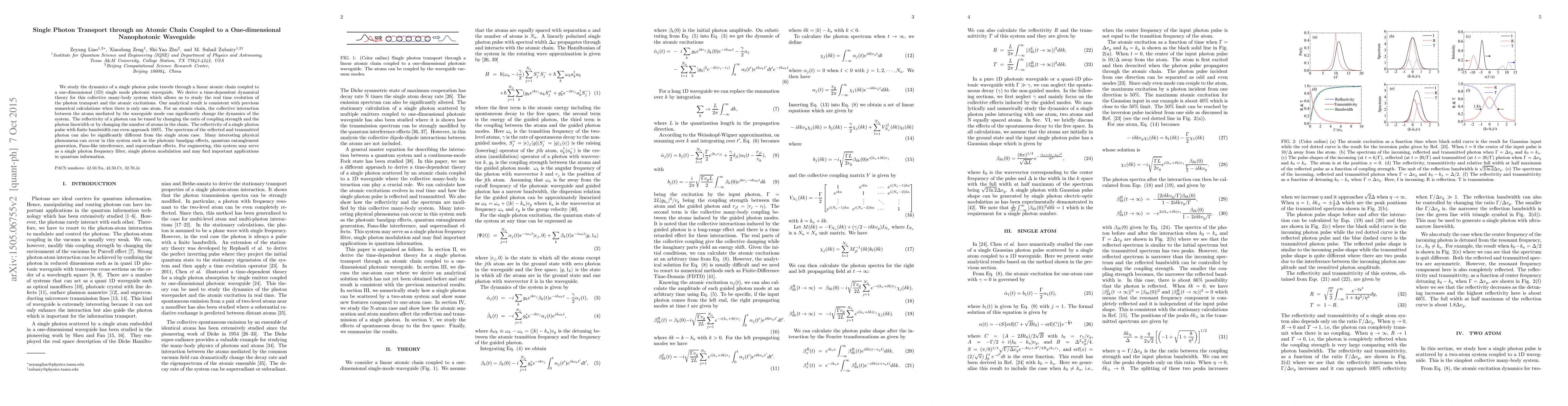 This research develops a dynamical theory for single photon transport in a linear atomic chain connected to a 1D photonic waveguide, showing that collective atomic interactions can dramatically alter photon dynamics, including tunable reflectivity and complex spectral effects. Potential applications include single photon modulation and quantum information processing.