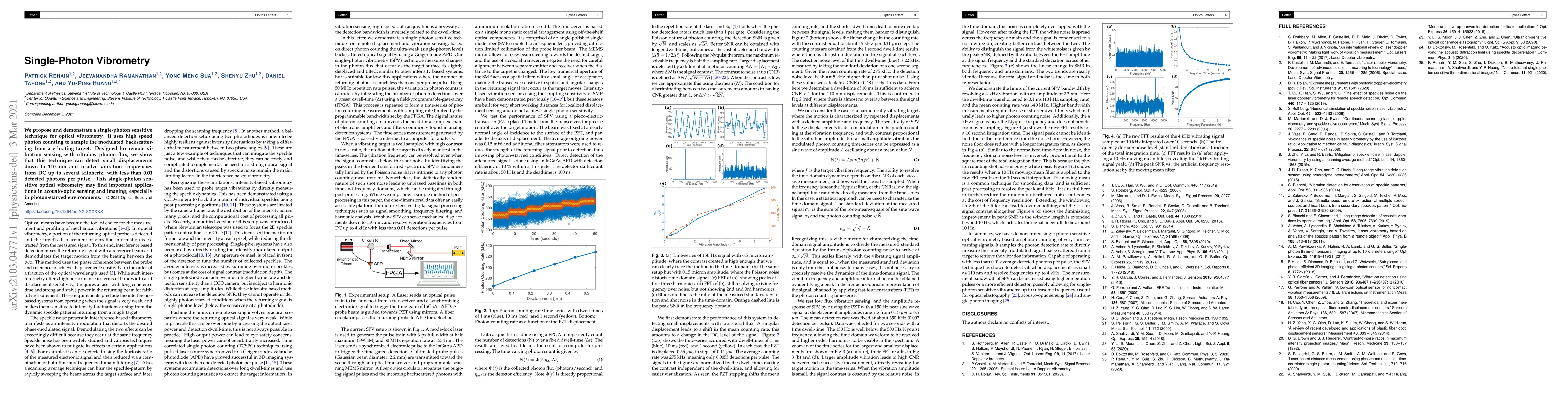 We propose and demonstrate a single-photon sensitive technique for optical vibrometry. It uses high speed photon counting to sample the modulated backscattering from a vibrating target. Designed for remote vibration sensing with ultralow photon flux, we show that this technique can detect small displacements down to 110 nm and resolve vibration frequencies from DC up to several kilohertz, with less than 0.01 detected photons per pulse. This single-photon sensitive optical vibrometry may find important applications in acousto-optic sensing and imaging, especially in photon-starved environments.