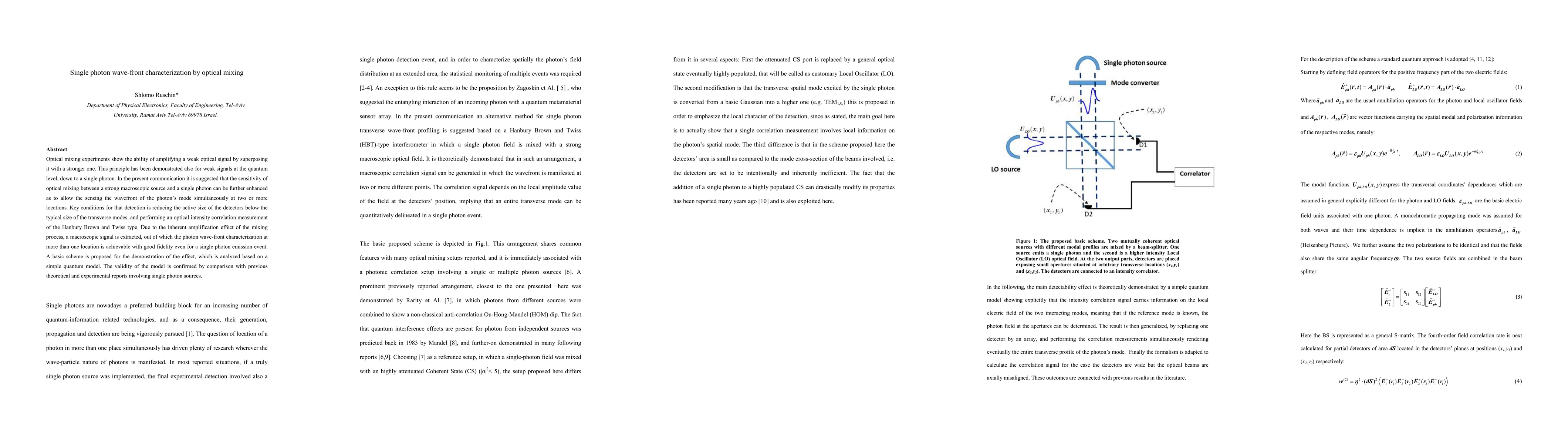 This paper proposes a method to characterize the wavefront of a single photon by using optical mixing with a strong macroscopic source, enhancing detection through intensity correlation measurements. The scheme aims to extract a macroscopic signal from the mixing process to achieve wavefront characterization at multiple locations with high fidelity.