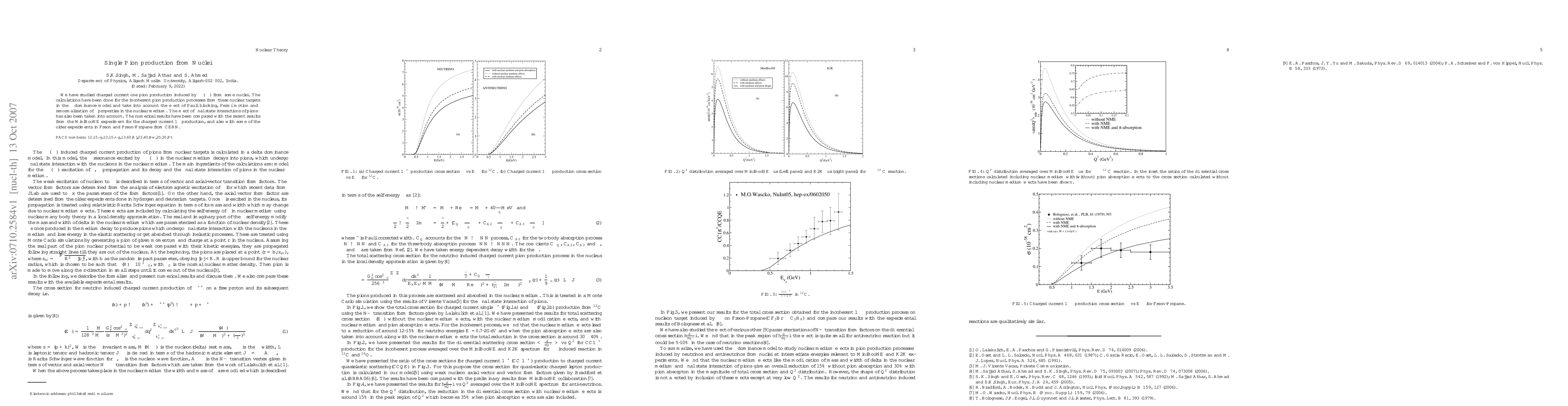 We have studied charged current one pion production induced by $\nu_\mu(\bar\nu_\mu)$ from some nuclei. The calculations have been done for the incoherent pion production processes from these nuclear targets in the $\Delta$ dominance model and take into account the effect of Pauli blocking, Fermi motion and renormalization of $\Delta$ properties in the nuclear medium. The effect of final state interactions of pions has also been taken into account. The numerical results have been compared with the recent results from the MiniBooNE experiment for the charged current 1$\pi$ production, and also with some of the older experiments in Freon and Freon-Propane from CERN.