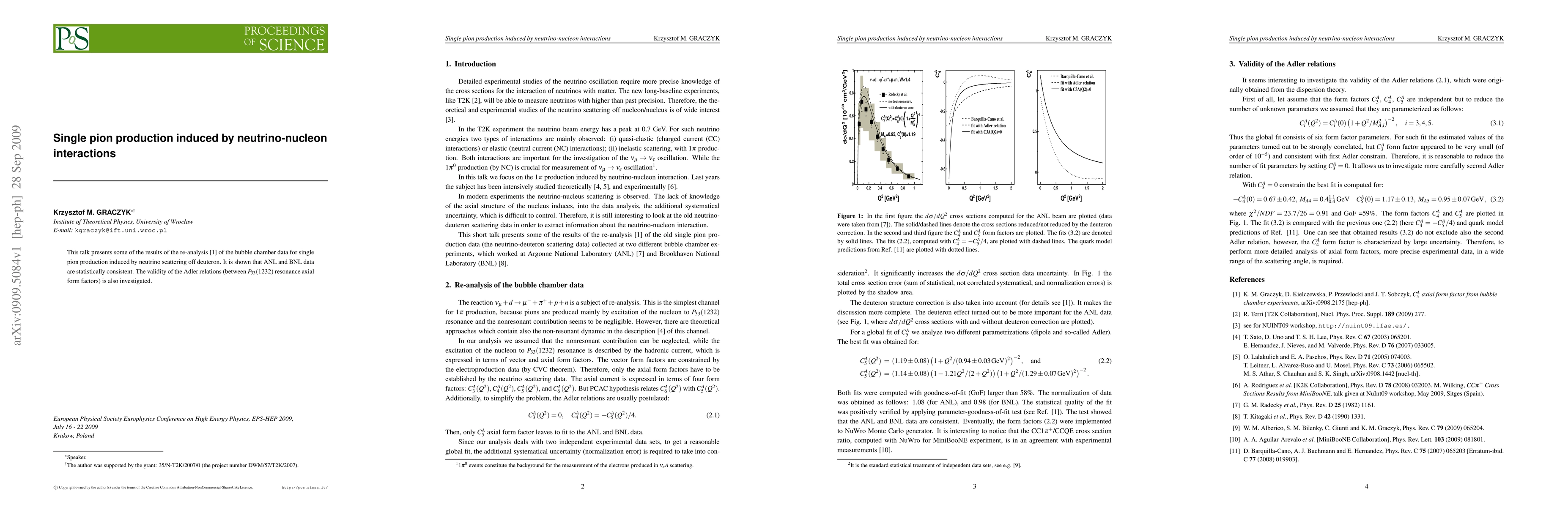 This talk presents some of the results of the re-analysis of [Graczyk et al.] of the bubble chamber data for single pion production induced by neutrino scattering off deuteron. It is shown that ANL and BNL data are statistically consistent. The validity of the Adler relations (between $P_{33}(1232)$ resonance axial form factors) is also investigated.