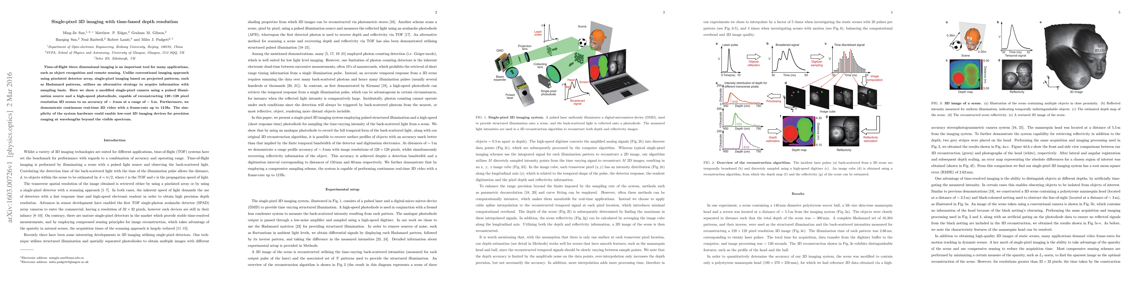This paper presents a modified single-pixel camera using pulsed illumination and high-speed photodiode to achieve 128x128 pixel resolution 3D imaging with ~3 mm accuracy at ~5 m range, enabling real-time 3D video at up to 12 Hz, potentially leading to low-cost precision ranging devices.