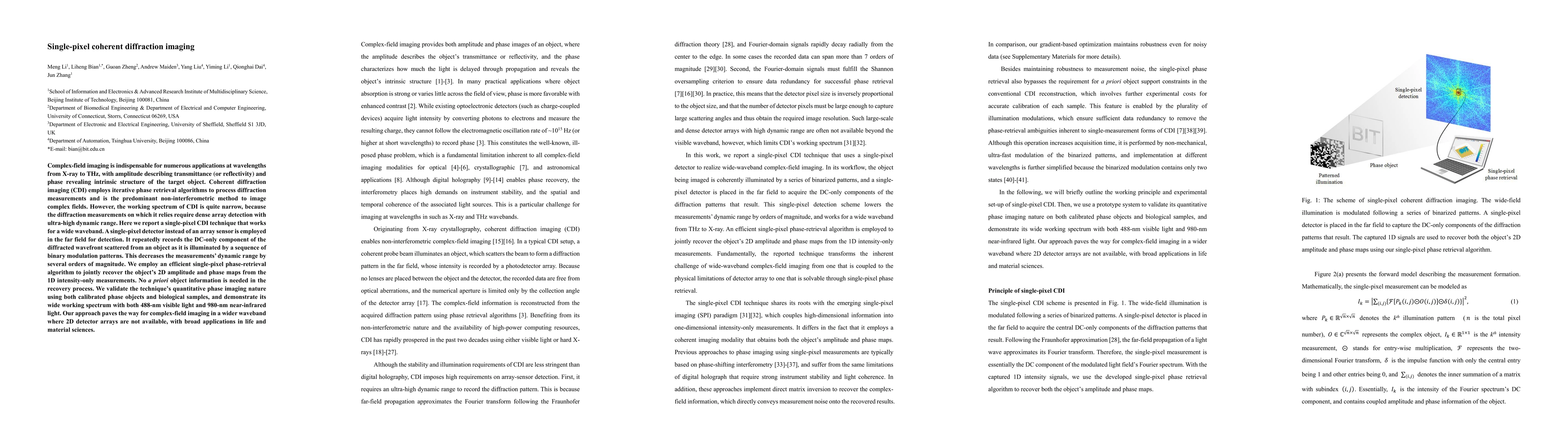 This paper introduces a single-pixel coherent diffraction imaging technique that extends the working spectrum to a wide waveband by using a single-pixel detector instead of a dense array, significantly reducing measurement dynamic range. The method successfully recovers 2D amplitude and phase maps from 1D intensity measurements without prior object information, validated with both phase objects and biological samples.