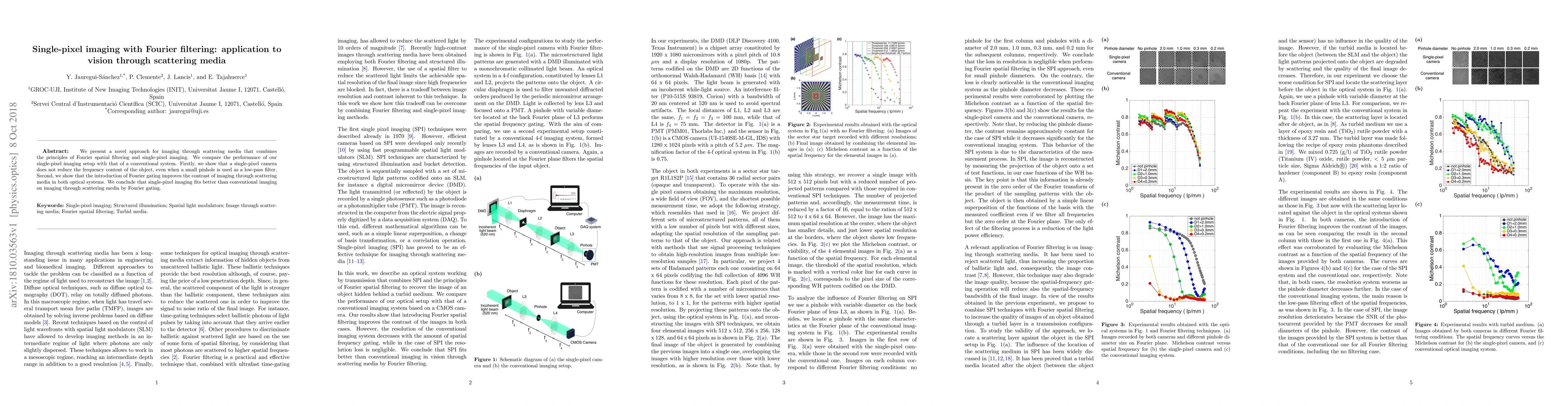 This paper introduces a novel single-pixel imaging method combining Fourier spatial filtering to enhance imaging through scattering media. It demonstrates that single-pixel imaging maintains object frequency content and improves contrast compared to conventional systems, especially when using Fourier gating.