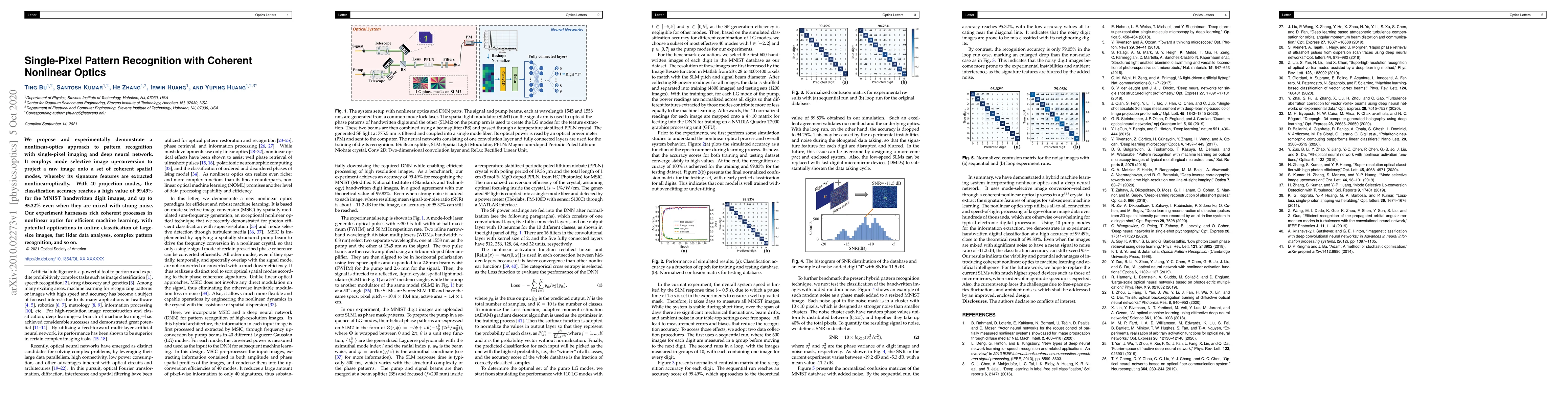 This paper proposes a nonlinear-optics method for single-pixel pattern recognition using deep neural networks and mode selective image up-conversion, achieving 99.49% accuracy on MNIST digits even with noise. The technique leverages coherent nonlinear processes for efficient machine learning applications.